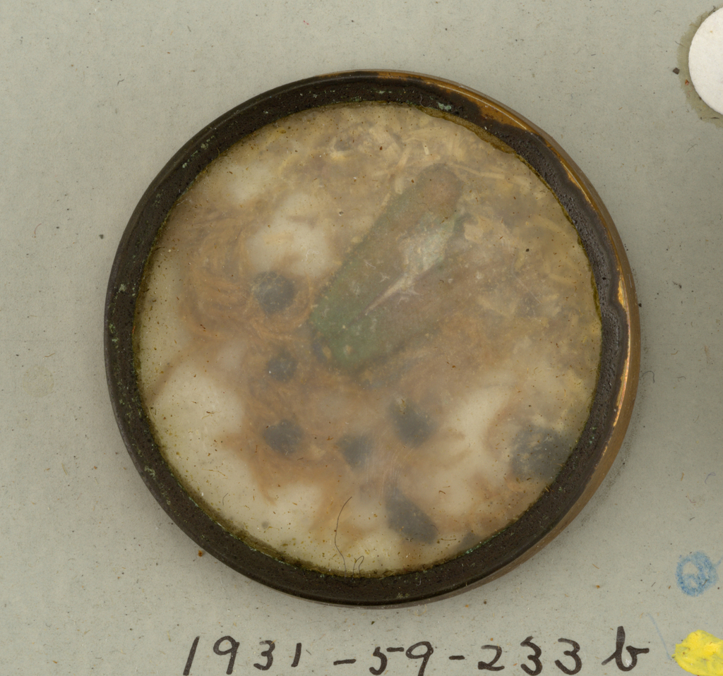 This is a buttons. It is dated late 18th century and we acquired it in 1931. Its medium is insects, shell, seaweed, paper, copper, tin, glass. It is a part of the Product Design and Decorative Arts department.