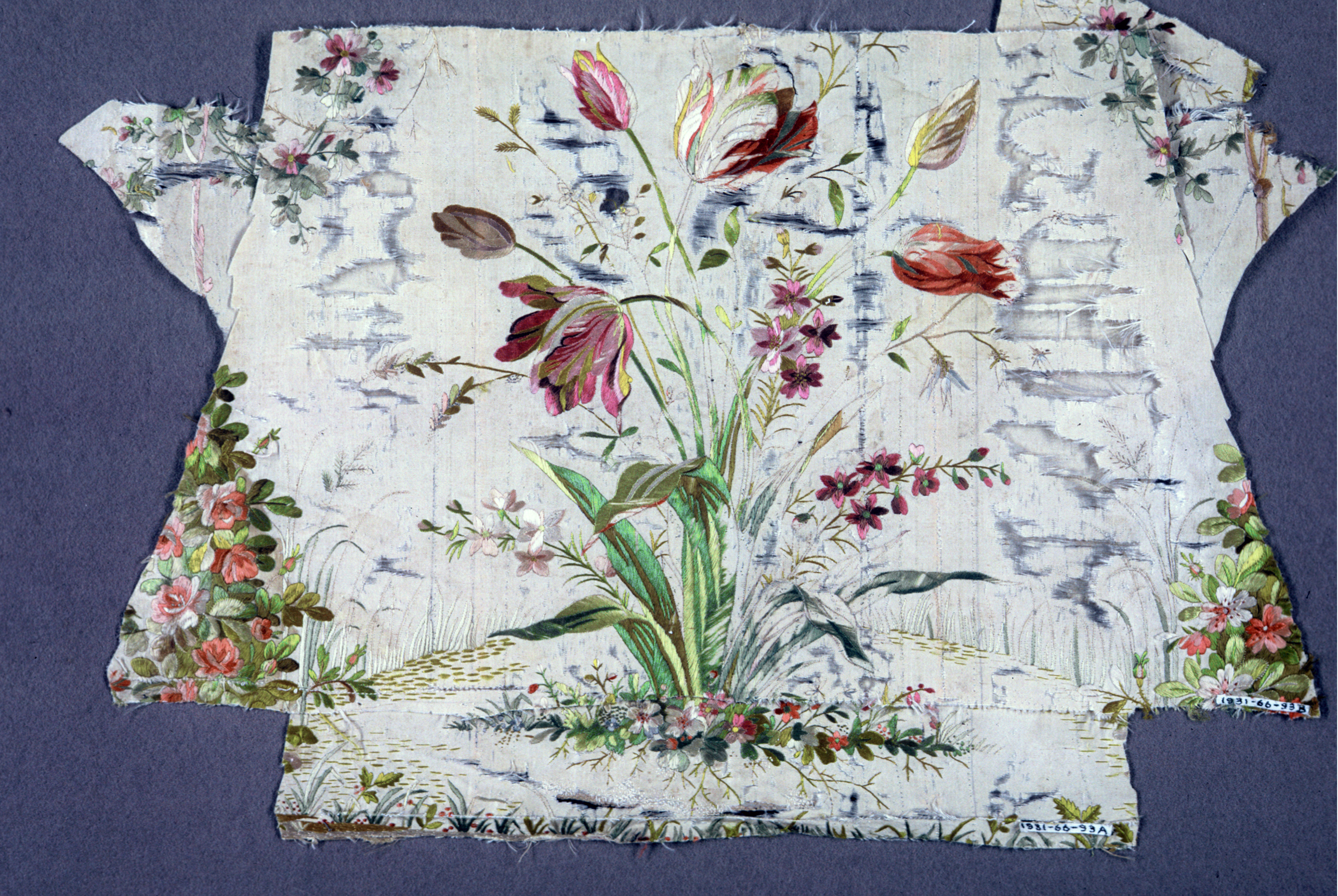 This is a Textile. It is dated ca. 1770 and we acquired it in 1931. Its medium is silk on silk and its technique is satin stitch embroidery. It is a part of the Textiles department.