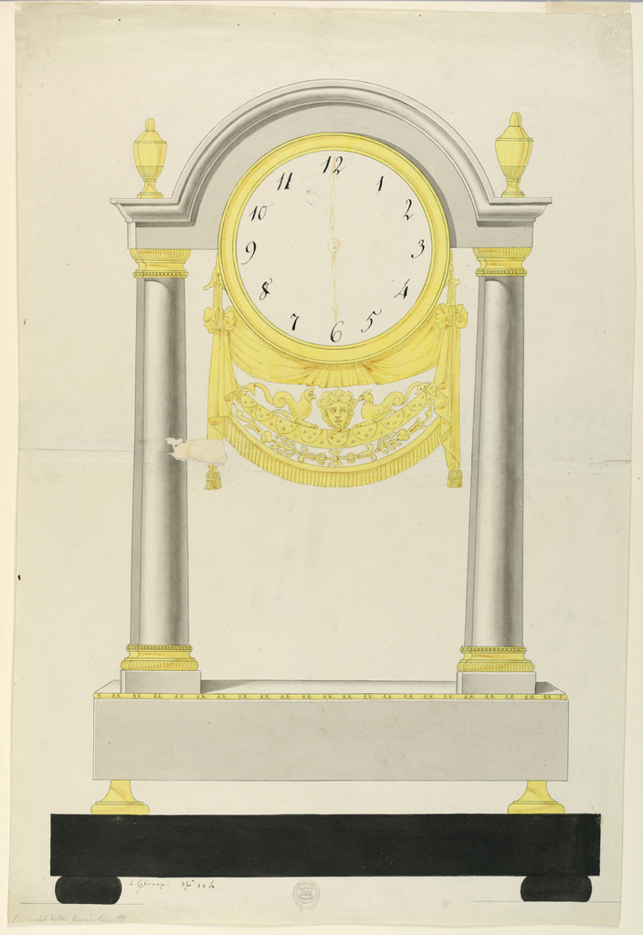 Drawing, Design for Clock; Manufactured by Lefebvre Manufactory, Tournai; Belgium; graphite, pen and brown ink, brush and yellow, grey, black and brown-red watercolor on cream laid paper; 52.3 x 35 cm (20 9/16 x 13 3/4 in.); Gift of Eleanor and Sarah Hewitt; 1931-71-20