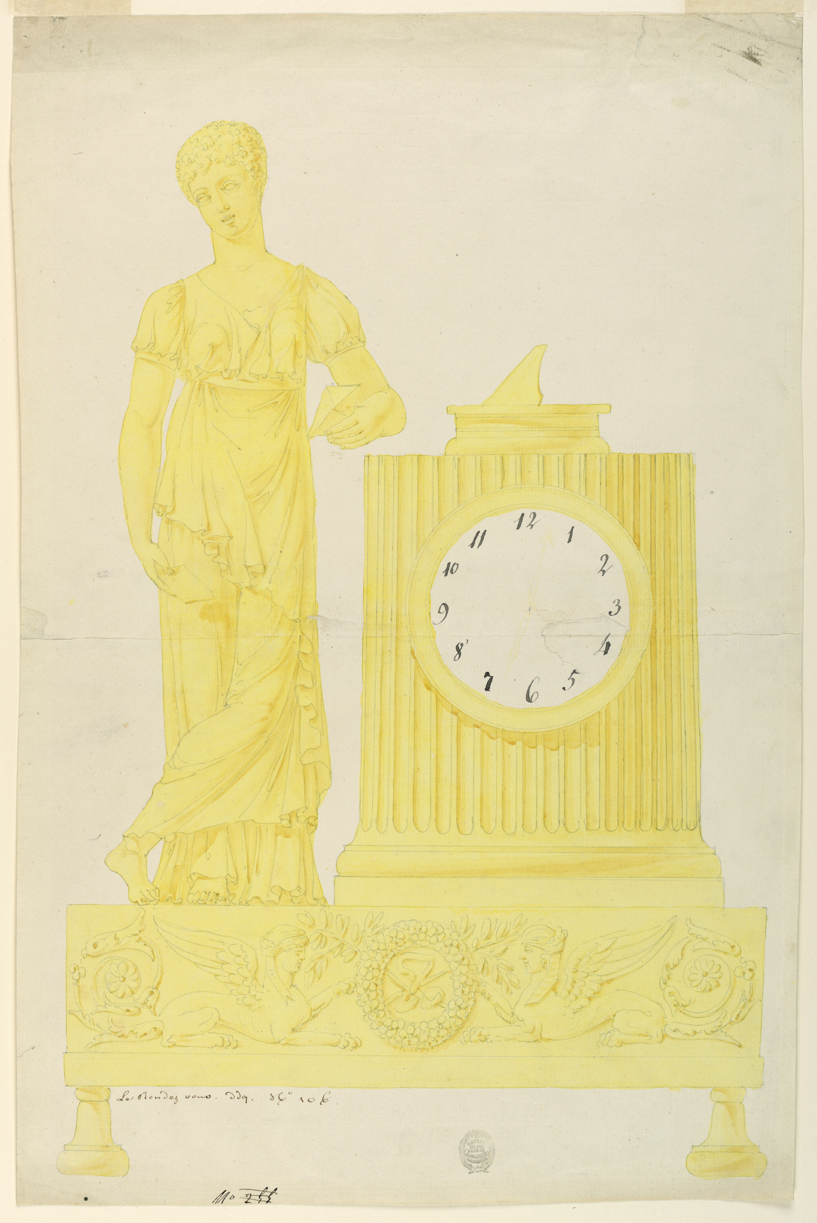 Drawing, Design for clock; Manufactured by Lefebvre Manufactory, Tournai; Belgium; pen and black ink, brush and yellow, red watercolor, on cream laid paper; 50.2 x 33 cm (19 3/4 x 13 in.); Gift of Eleanor and Sarah Hewitt; 1931-71-5