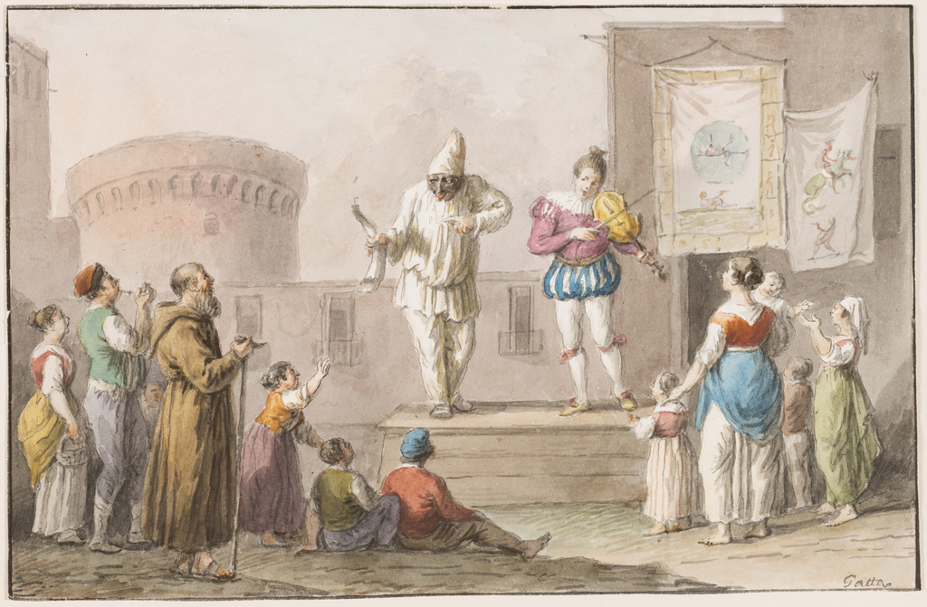 Drawing, Water color; Performers of a Commedia dell'Arte; Designed by Saverio della Gatta (Italian, 1777 - 1829); Italy; pen and black ink and water colors on paper.; 11.8 × 18.1 cm (4 5/8 × 7 1/8 in.); Gift of Eleanor and Sarah Hewitt; 1931-73-15