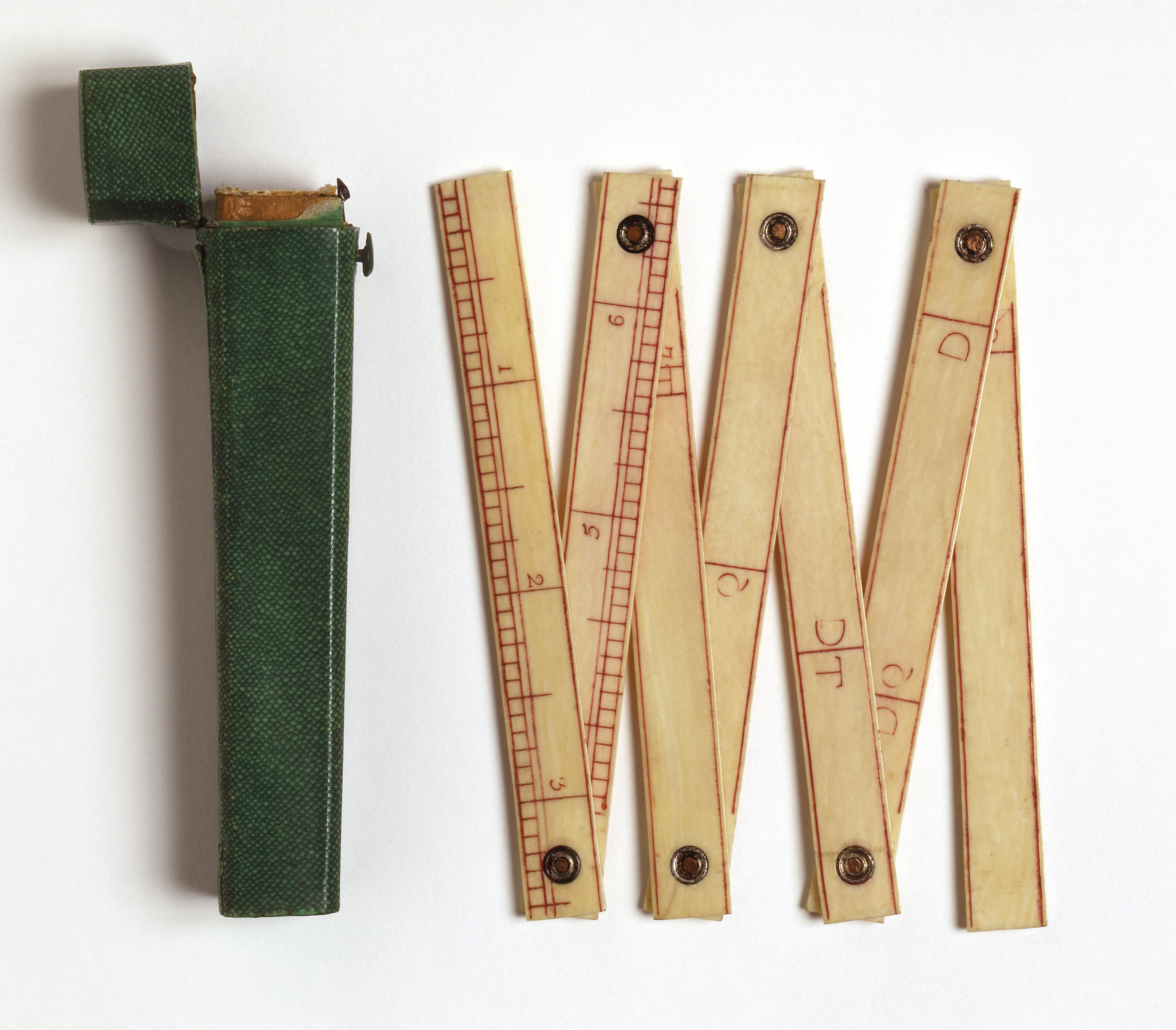 This is a Folding ruler and case. It is dated late 18th century and we acquired it in 1931. Its medium is ivory (ruler), shagreen on wood core (case). It is a part of the Product Design and Decorative Arts department.
