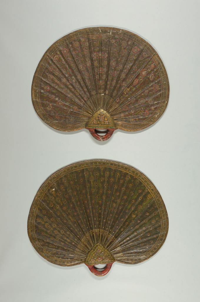 Fan; leather, painted and gilded; H x W x D: 61 x 72 x 2.4 cm (24 x 28 3/8 x 15/16 in.); Gift of Eleanor and Sarah Hewitt; 1931-88-109-a,b