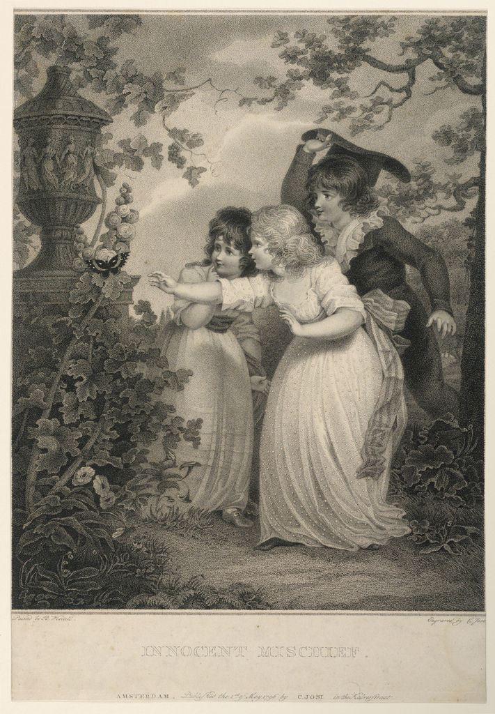 Inscribed below, lower left: Painted by R. Westall; lower center: INNOCENT MISCHIEF; lower right: Engraved by C. Josi; below: [publisher's name and address, and date]