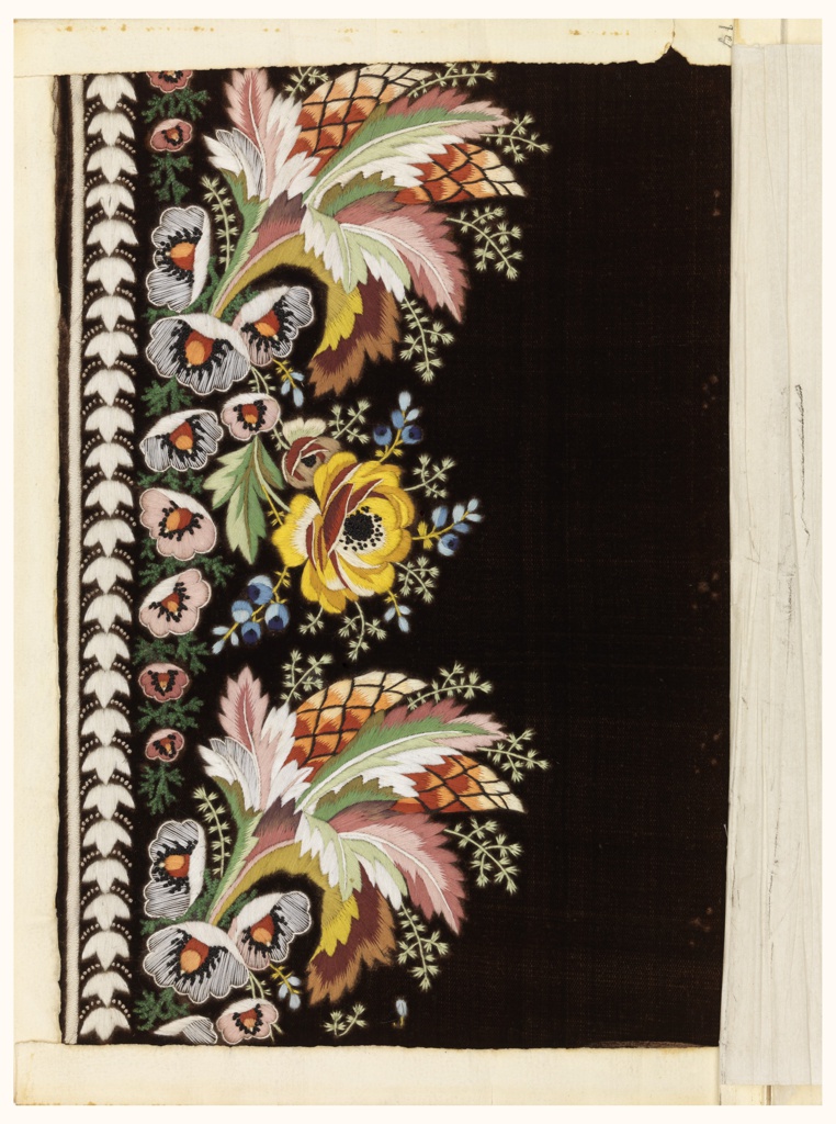 This is a Embroidery sample. It is dated ca. 1770 and we acquired it in 1932. Its medium is silk, paper and its technique is embroidered on supplementary warp cut pile (velvet). It is a part of the Textiles department.