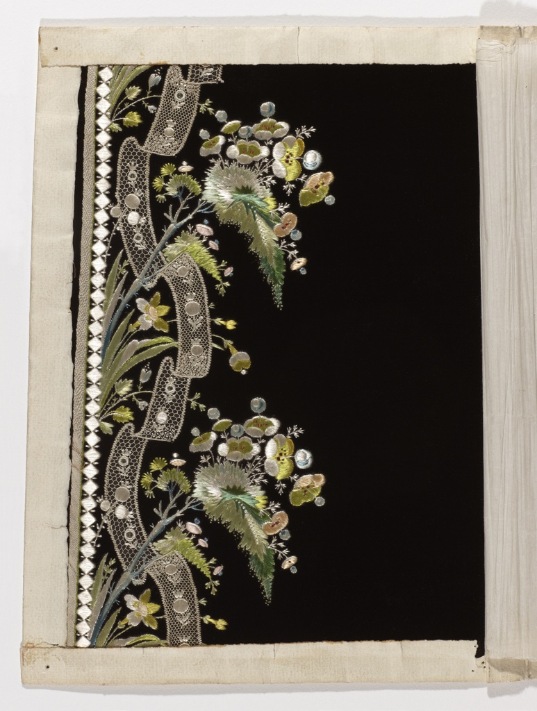 This is a Embroidery sample. It is dated ca. 1800 and we acquired it in 1932. Its medium is silk, linen, paper, bobbin net and its technique is embroidered and appliquéd on cut supplementary warp pile (velvet); in paper envelope. It is a part of the Textiles department.