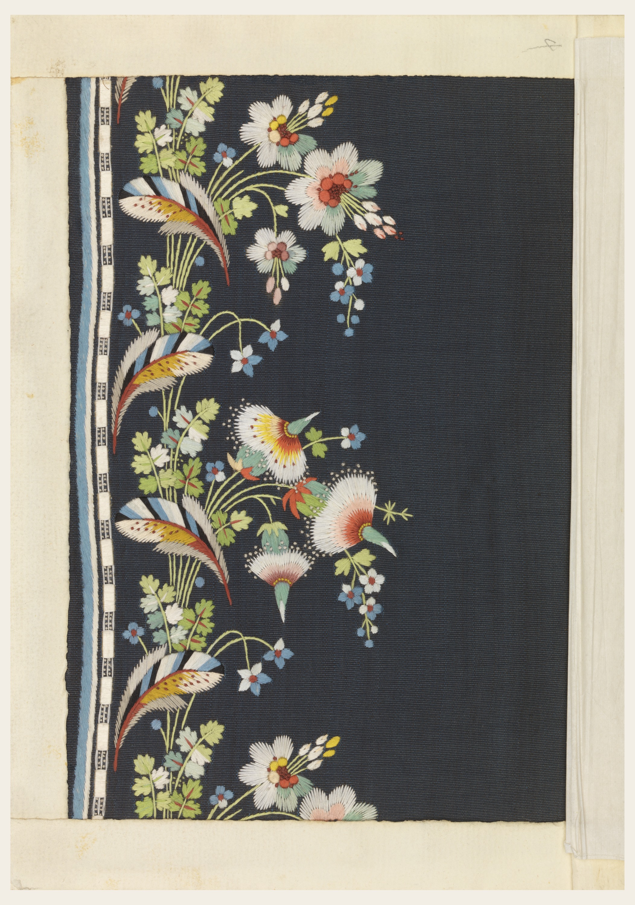 These embroidery samples haven been in their original paper enclosures for over 200 years, preserving their brilliant color and pristine condition. The samples likely represent designs for men’s coats although embroidery houses could produce designs on any fabric according to a client’s wishes. While consumers in Paris could visit the marchand-merciers (retailers) to see samples in person, these paper envelopes were highly portable, meaning selling agents could take orders from customers far removed from the city center. Paris was widely recognized as the capital of fashion, and this perception was due mainly to the large volume of high-quality textiles produced in Lyon specifically for the Paris trade. By the 18th century, the textile industry in Lyon employed thousands of men and women. Local government and business leaders recognized Lyon’s special place in the textile design and production—it was the first to introduce seasonal changes in silk design. With the goal of training the next generation of textile designers, in 1756 leaders proposed opening a free school for flower painting under the leadership of a flower specialist with some knowledge of fabric design. It was not until the end of the century that the school produced its finest graduate, the talented designer Jean François Bony (French, 1754–1825), whose influence here is evident.
