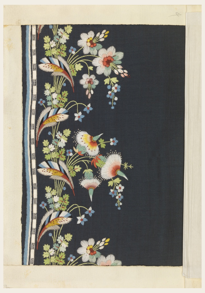 This is a Embroidery sample. It is dated ca. 1790 and we acquired it in 1932. Its medium is silk, paper and its technique is embroidered on a compound foundation. It is a part of the Textiles department.