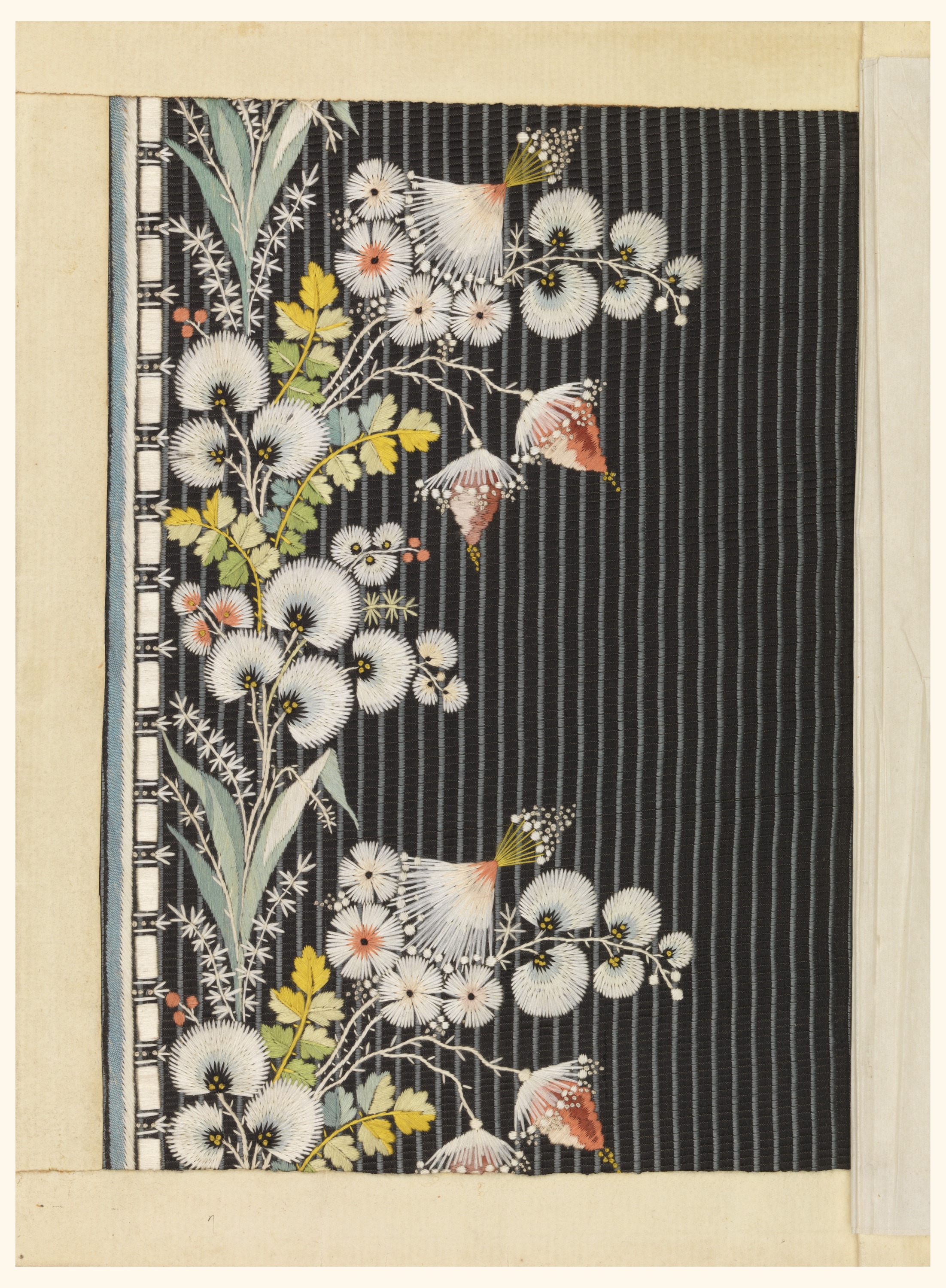 This is a Embroidery sample. It is dated 1790–1800 and we acquired it in 1932. Its medium is silk, paper and its technique is embroidered on a compound foundation. It is a part of the Textiles department.
