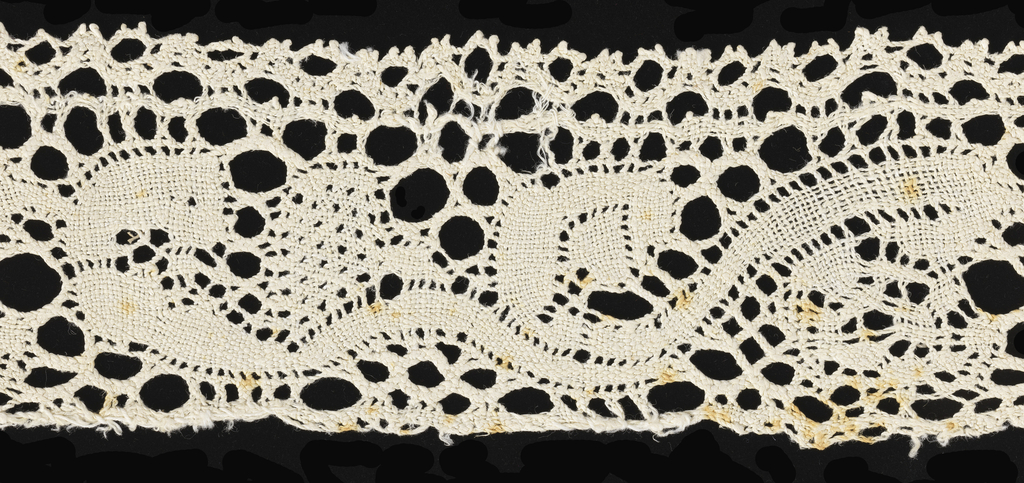 This is a Fragment. It is dated 18th–19th century and we acquired it in 1933. Its medium is linen and its technique is bobbin lace, binche with no ground. It is a part of the Textiles department.