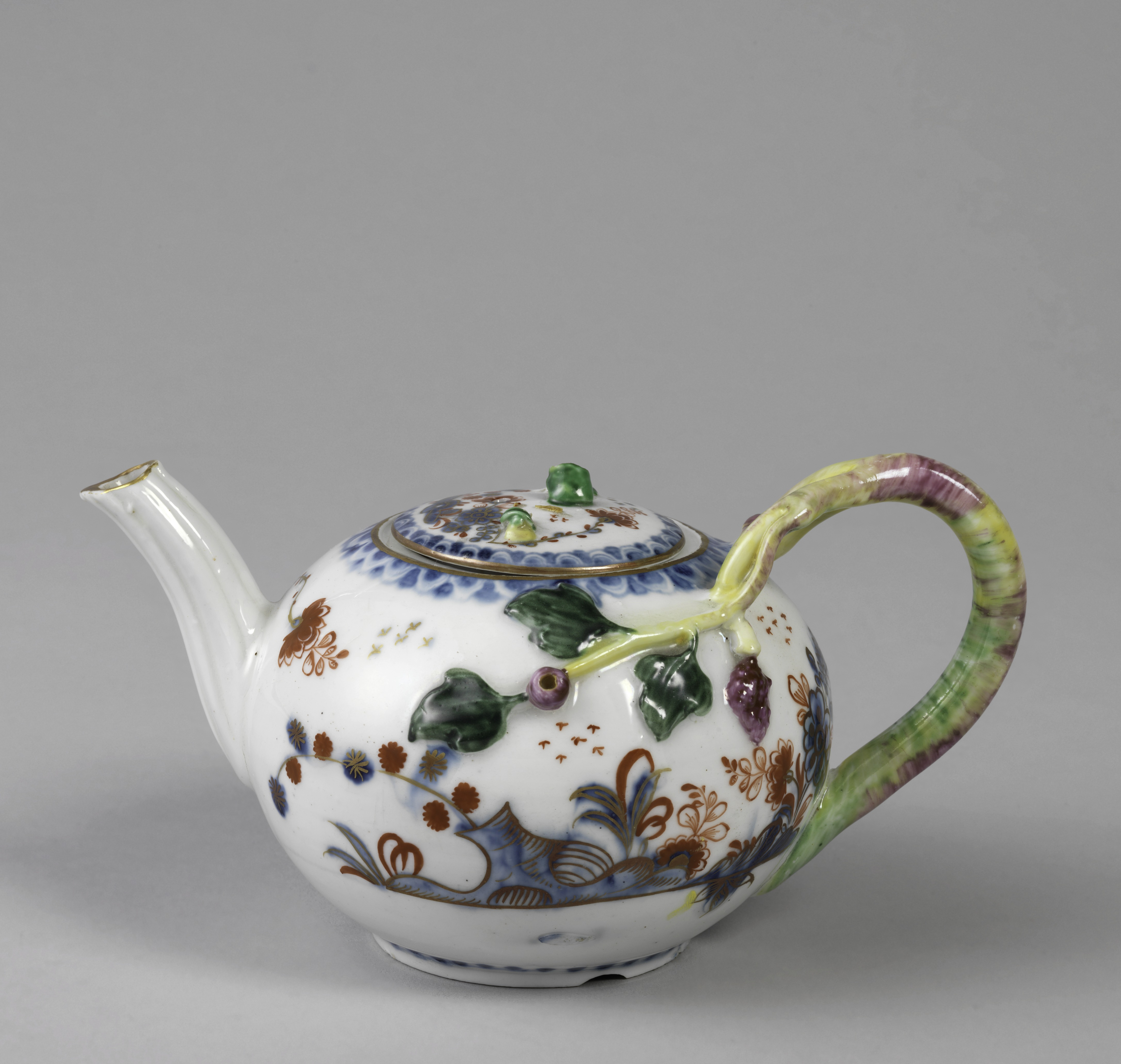 This is a teapot. It was manufactured by Cozzi Porcelain Factory. It is dated ca. 1765 and we acquired it in 1936. Its medium is hard paste porcelain, vitreous enamel, gold. It is a part of the Product Design and Decorative Arts department.