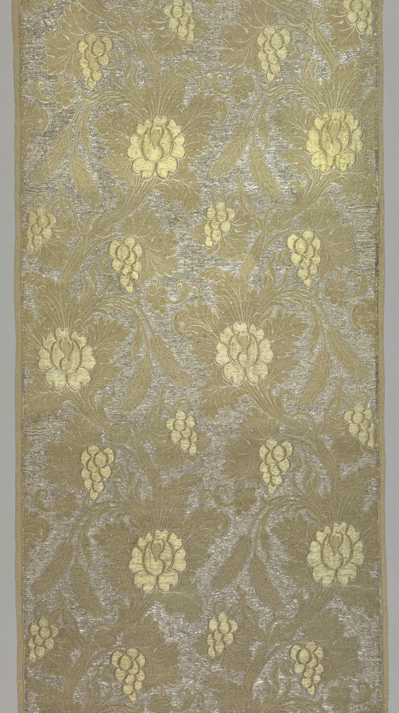 This is a Textile. It is dated 18th century and we acquired it in 1937. Its medium is silk, metallic thread and its technique is plain weave with supplementary weft. It is a part of the Textiles department.