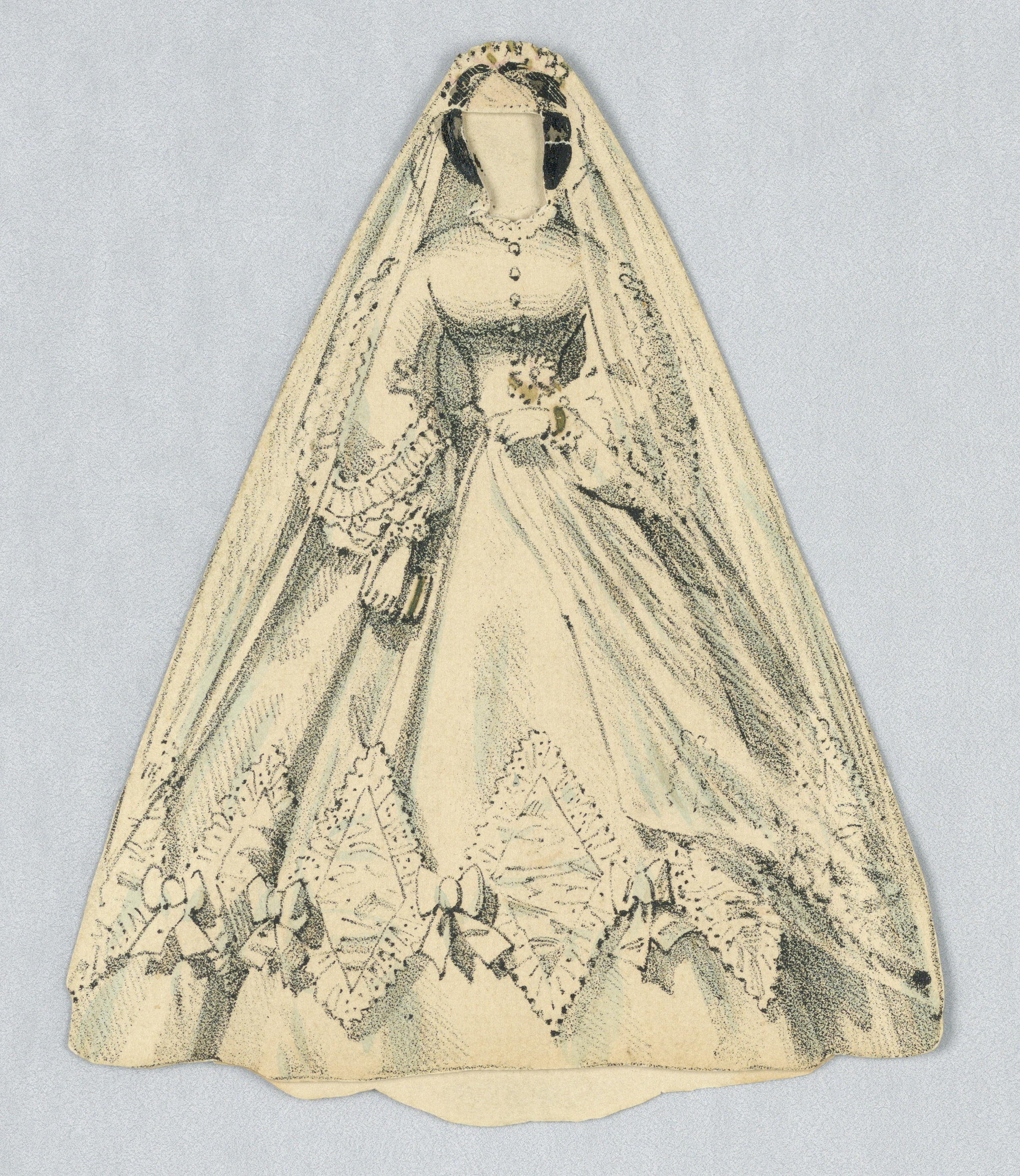 Print, Paper Doll Costume, White Veiled Dress; USA; lithograph, brush and watercolor on cream heavy wove paper; H x W: 9.8 x 8 cm (3 7/8 x 3 1/8 in.), irregular; Gift of Grace Lincoln Temple; 1937-22-14