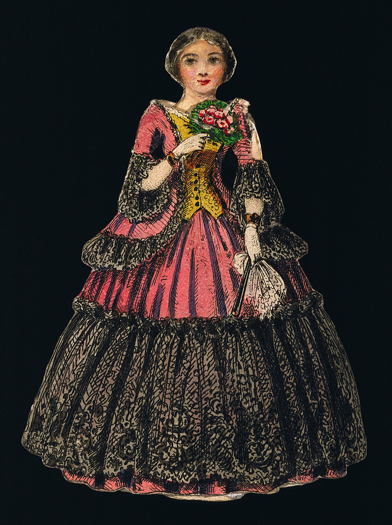 <ref name=CH>{{cite web |url=https://www-4.collection.cooperhewitt.org/objects/18344253/ |title=Print, Paper Doll Costume in Pink with Black Lace and Yellow Bodice |author=Cooper Hewitt, Smithsonian Design Museum |accessdate=20 December 2025 |publisher=Smithsonian Institution}}</ref>
