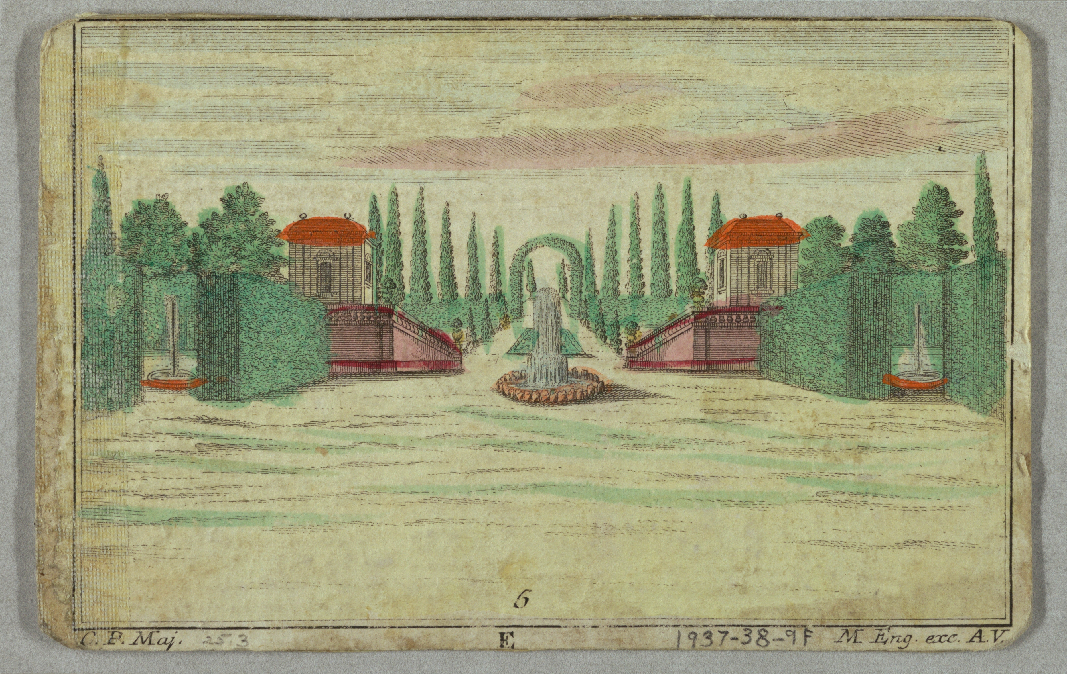 Print, Opera (Peep-show); Martin Engelbrecht (German, 1684–1756); Germany; engraving, brush and watercolor on paper; 9.5 x 15 cm (3 3/4 x 5 7/8 in.); Gift of Mrs. James Ward Thorne; 1937-38-9-f