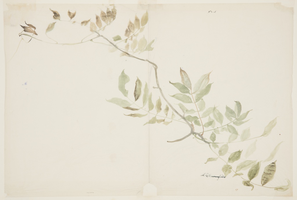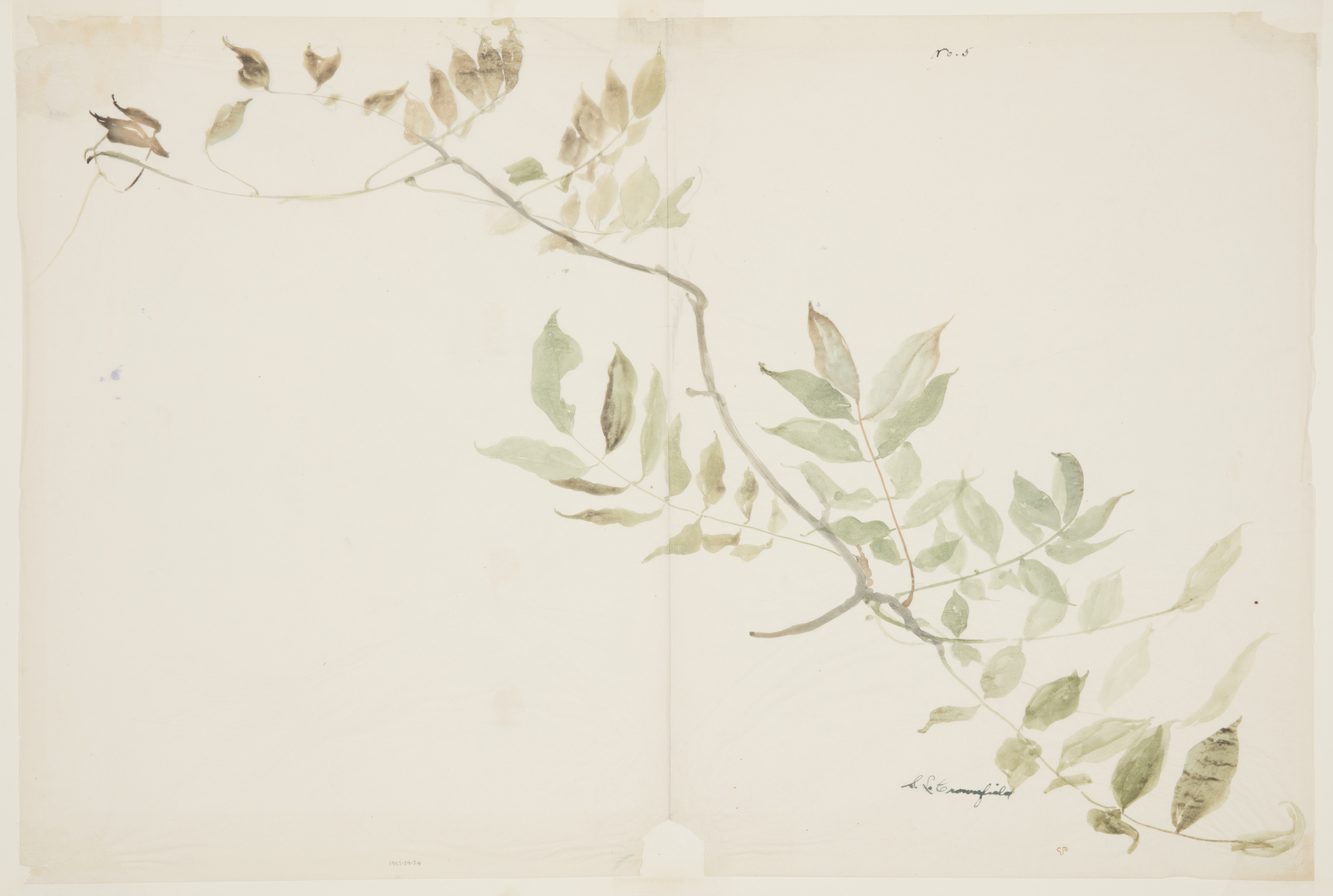 Drawing, Study of Wisteria Foliage; Designed by Sophia L. Crownfield (American, 1862–1929); USA; brush and watercolor on white tissue paper; 50.8 × 75.2 cm (20 in. × 29 5/8 in.) Mat: 76.2 × 101.6 cm (30 × 40 in.); Gift of Starling W. Childs and Ward Cheney; 1937-59-24