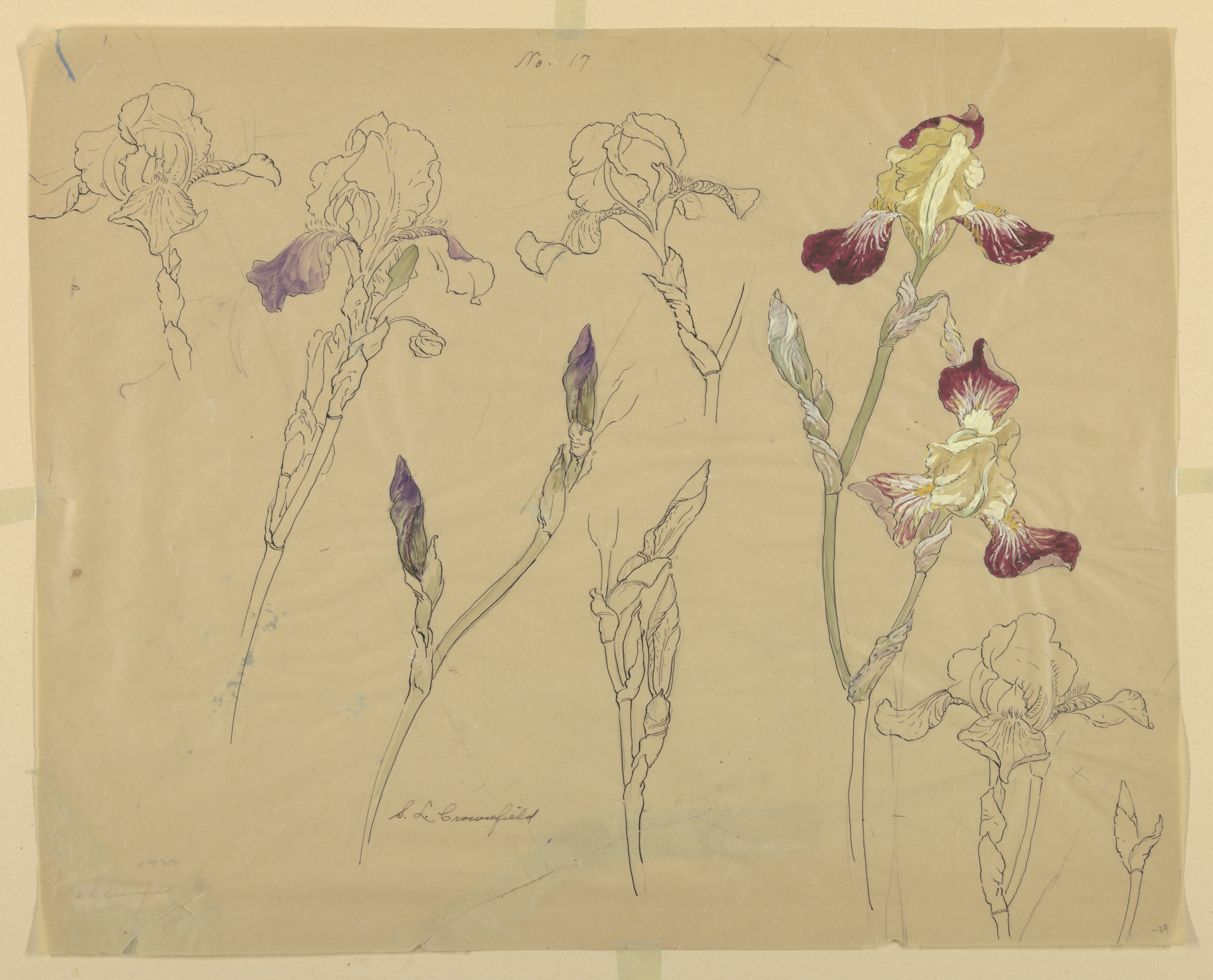 Drawing, Studies of Irises; Designed by Sophia L. Crownfield (American, 1862–1929); USA; graphite, pen and ink, brush and watercolor on yellow tracing paper; 47.5 × 58.7 cm (18 11/16 × 23 1/8 in.) Mat: 76.2 × 101.6 cm (30 × 40 in.); Gift of Starling W. Childs and Ward Cheney; 1937-59-38