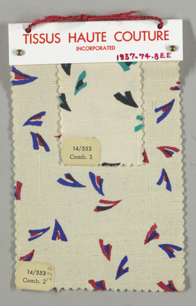 This is a Sample books. It is dated 1937 and we acquired it in 1937. Its medium is silk, linen, paper, celluloid and its technique is printed, compound and double cloth. It is a part of the Textiles department.