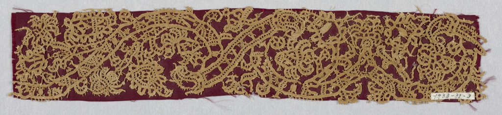 This is a Fragment. We acquired it in 1938. Its medium is linen and its technique is punto in aria needle lace. It is a part of the Textiles department.