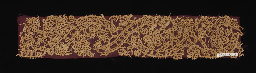 This is a Fragment. We acquired it in 1938. Its medium is linen and its technique is punto in aria needle lace. It is a part of the Textiles department.