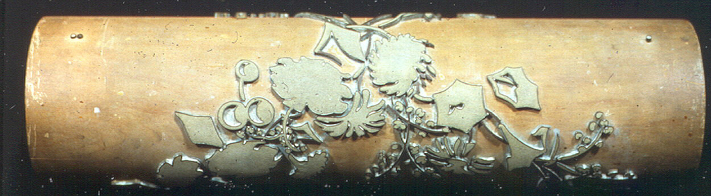 This is a Printing roller. It is dated 1937 and we acquired it in 1938. Its medium is wood, metal. It is a part of the Wallcoverings department.