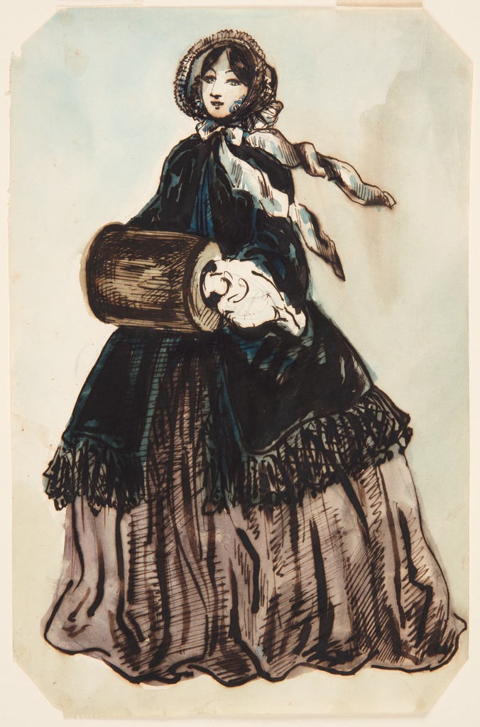 Drawing, La dame au châle (Lady in a Shawl); Designed by Constantin Guys (French, 1802 – 1892); France; pen and brown ink, brush and purple, tan, and blue wash, graphite on white paper; H x W: 28.3 × 18.3 cm (11 1/8 × 7 3/16 in.); Bequest of Erskine Hewitt; 1938-57-104