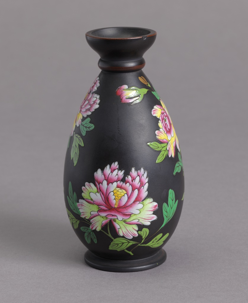Vase; Manufactured by Wedgwood (United Kingdom); stoneware (black basalt), enameled and painted decoration; 12.9 x 7 cm (5 1/16 x 2 3/4 in.); Bequest of Erskine Hewitt; 1938-57-313