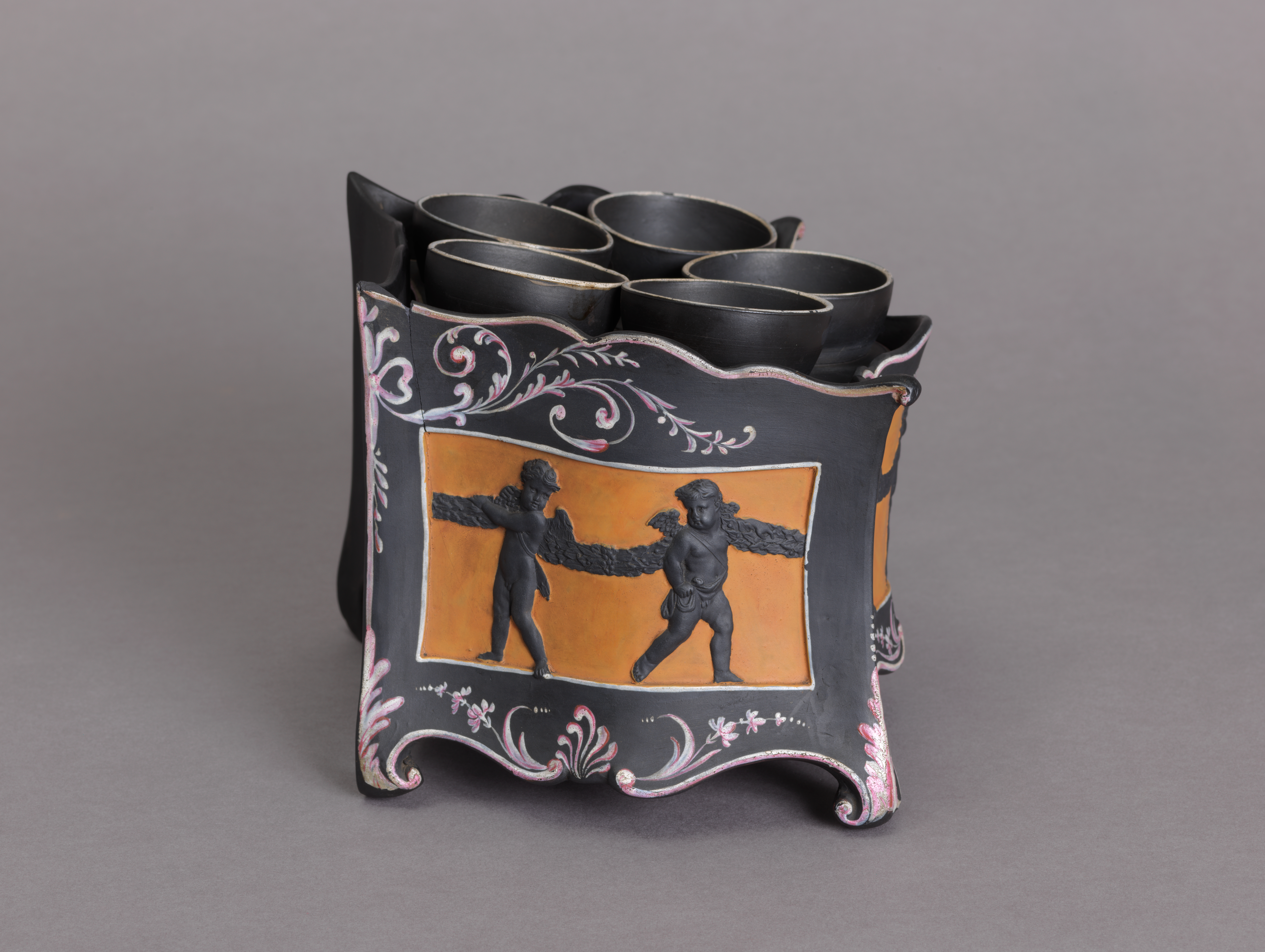 Black Basalt Bulb Pot Bulb Pot; Designed by John Flaxman (English, 1755 - 1826); Made by Wedgwood (United Kingdom); England; stoneware, enamel slip ('encaustic') decoration; H x W x D (a,b: overall): 14.4 × 21.1 × 16 cm (5 11/16 × 8 5/16 × 6 5/16 in.) H x W x D (a: pot): 14.4 × 21.1 × 16 cm (5 11/16 × 8 5/16 × 6 5/16 in.) H x W x D (b: removable collar): 3 × 17.1 × 13.5 cm (1 3/16 × 6 3/4 × 5 5/16 in.); Bequest of Erskine Hewitt; 1938-57-316-a,b