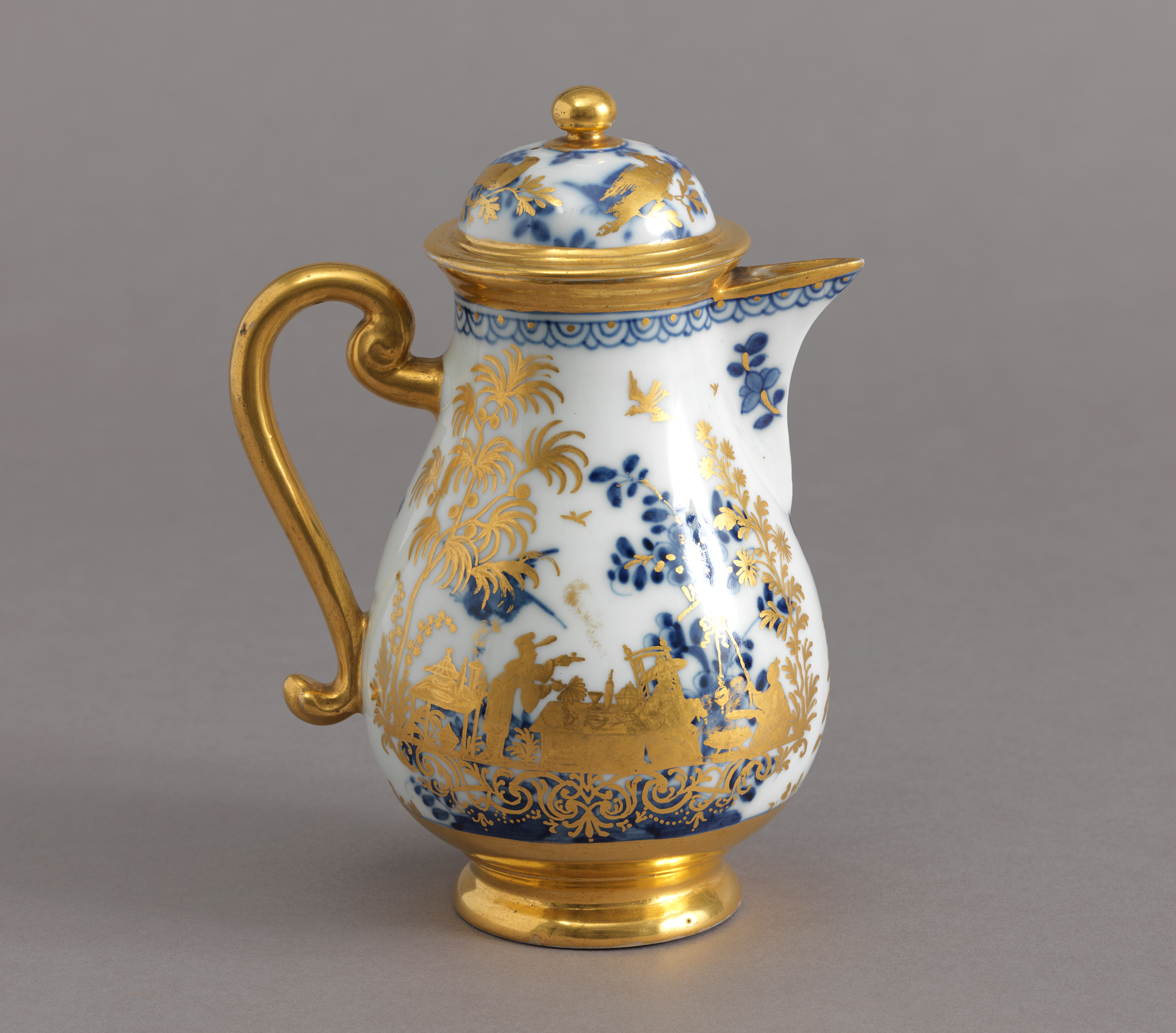This is a coffeepot. It was manufactured by Meissen Porcelain Manufactory and gilded by Bartholomäus Seuter. It is dated 1725–1735 and we acquired it in 1938. Its medium is hard paste porcelain, vitreous enamel, gold, brass. It is a part of the Product Design and Decorative Arts department.