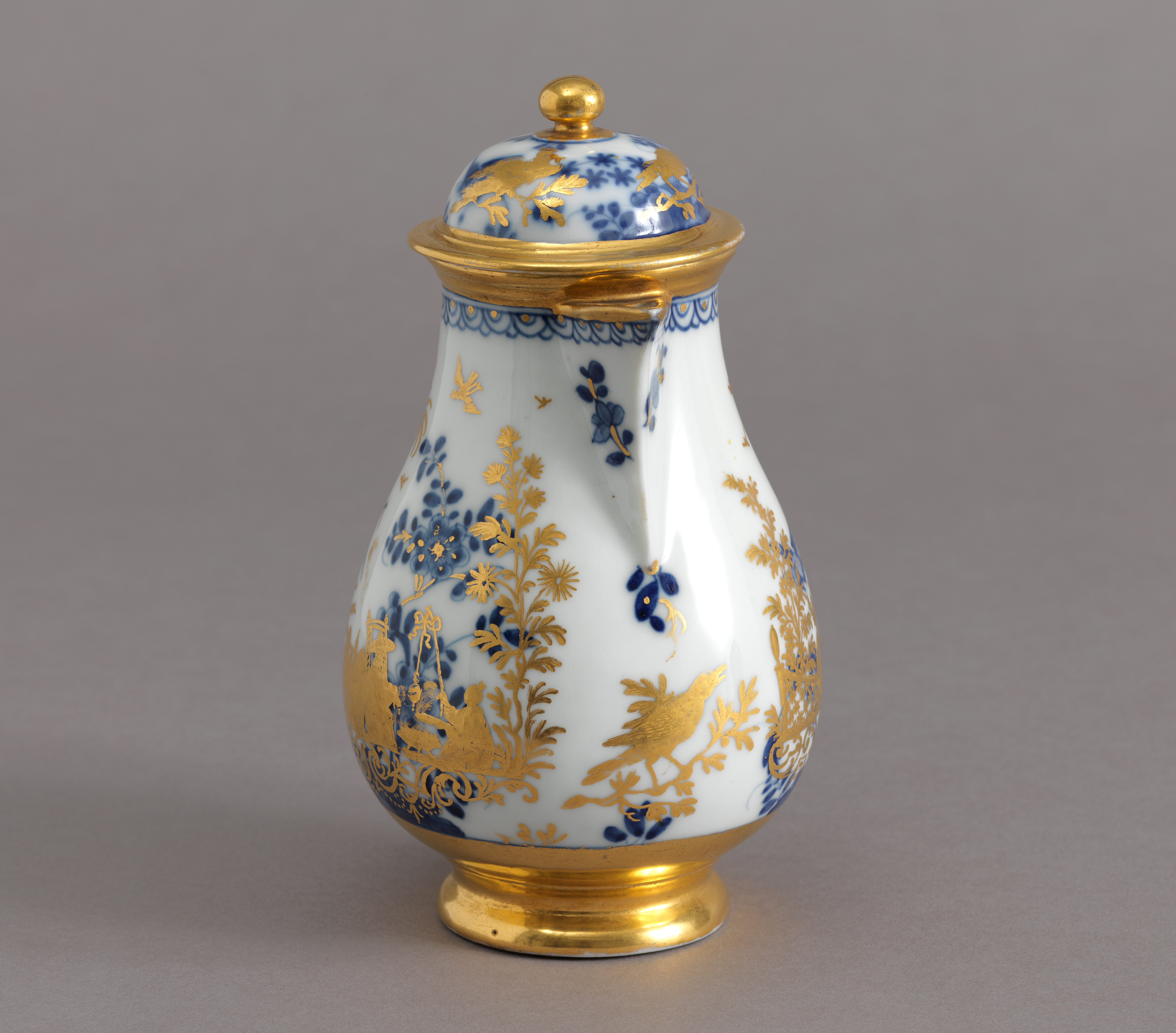 This is a coffeepot. It was manufactured by Meissen Porcelain Manufactory and gilded by Bartholomäus Seuter. It is dated 1725–1735 and we acquired it in 1938. Its medium is hard paste porcelain, vitreous enamel, gold, brass. It is a part of the Product Design and Decorative Arts department.