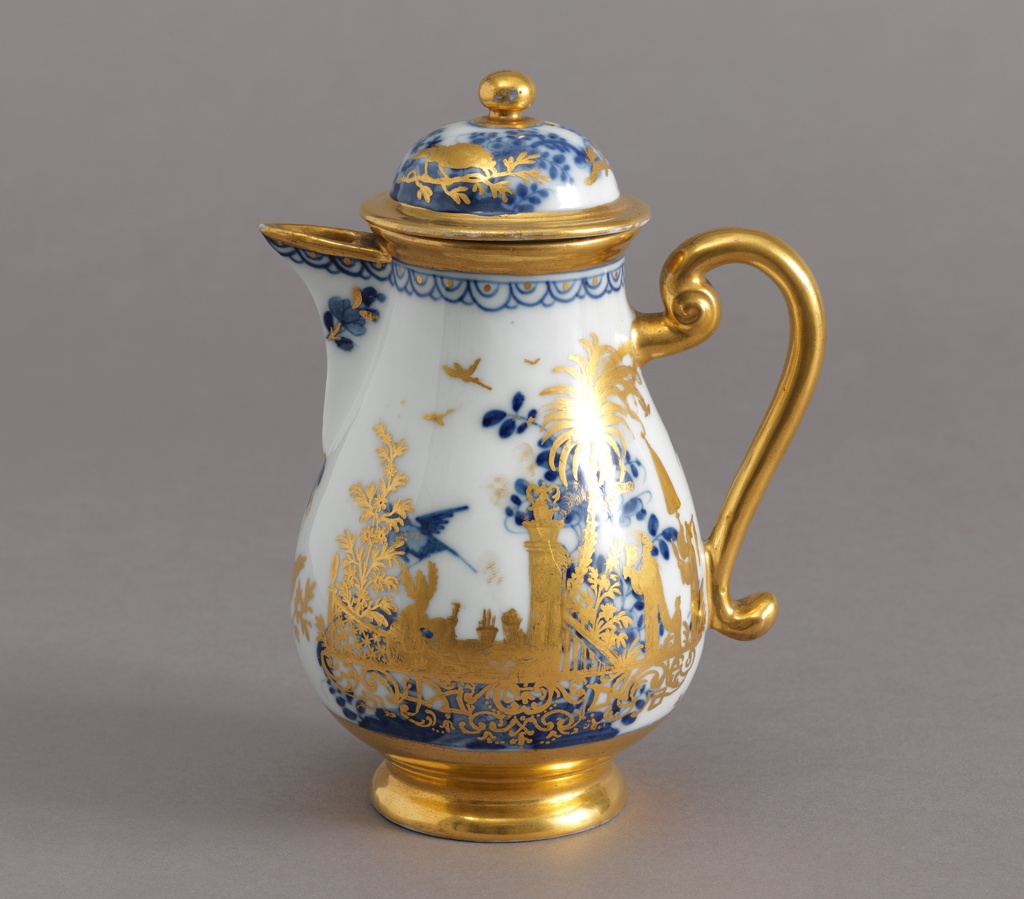 This is a coffeepot. It was manufactured by Meissen Porcelain Manufactory and gilded by Bartholomäus Seuter. It is dated 1725–1735 and we acquired it in 1938. Its medium is hard paste porcelain, vitreous enamel, gold, brass. It is a part of the Product Design and Decorative Arts department.