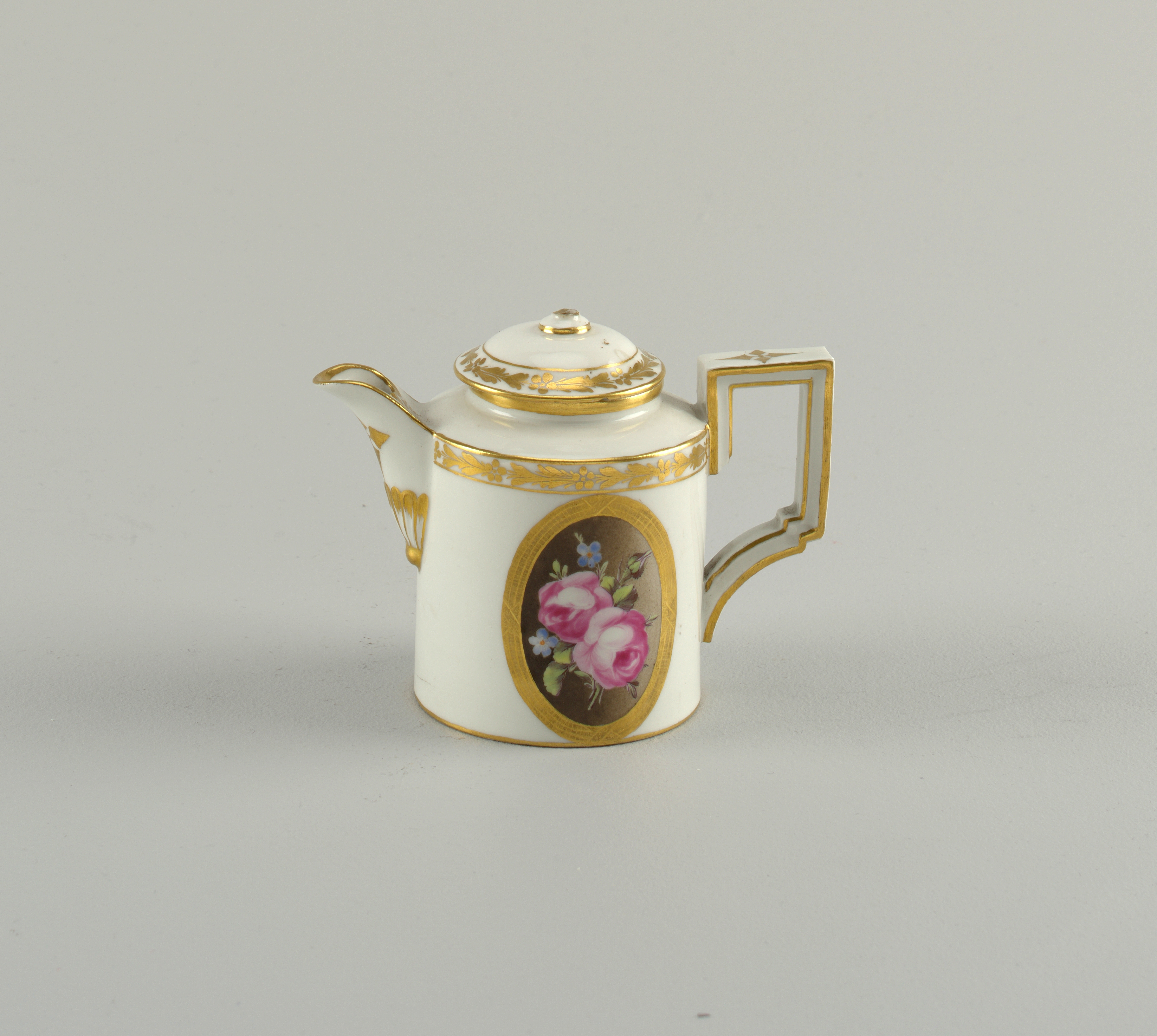 Coffeepot with Rose Medallion Coffeepot; Manufactured by Fürstenberg Porcelain Manufactory (Germany); hard paste porcelain, vitreous enamel, gold; H x W x D (a,b: overall): 9.7 × 12.5 × 6.9 cm (3 13/16 × 4 15/16 × 2 11/16 in.) H x W x D (a: pot): 8 × 12.5 × 6.9 cm (3 1/8 × 4 15/16 × 2 11/16 in.) H x diam. (b: lid): 3.2 × 5 cm (1 1/4 × 1 15/16 in.); Bequest of Erskine Hewitt; 1938-57-706-a,b