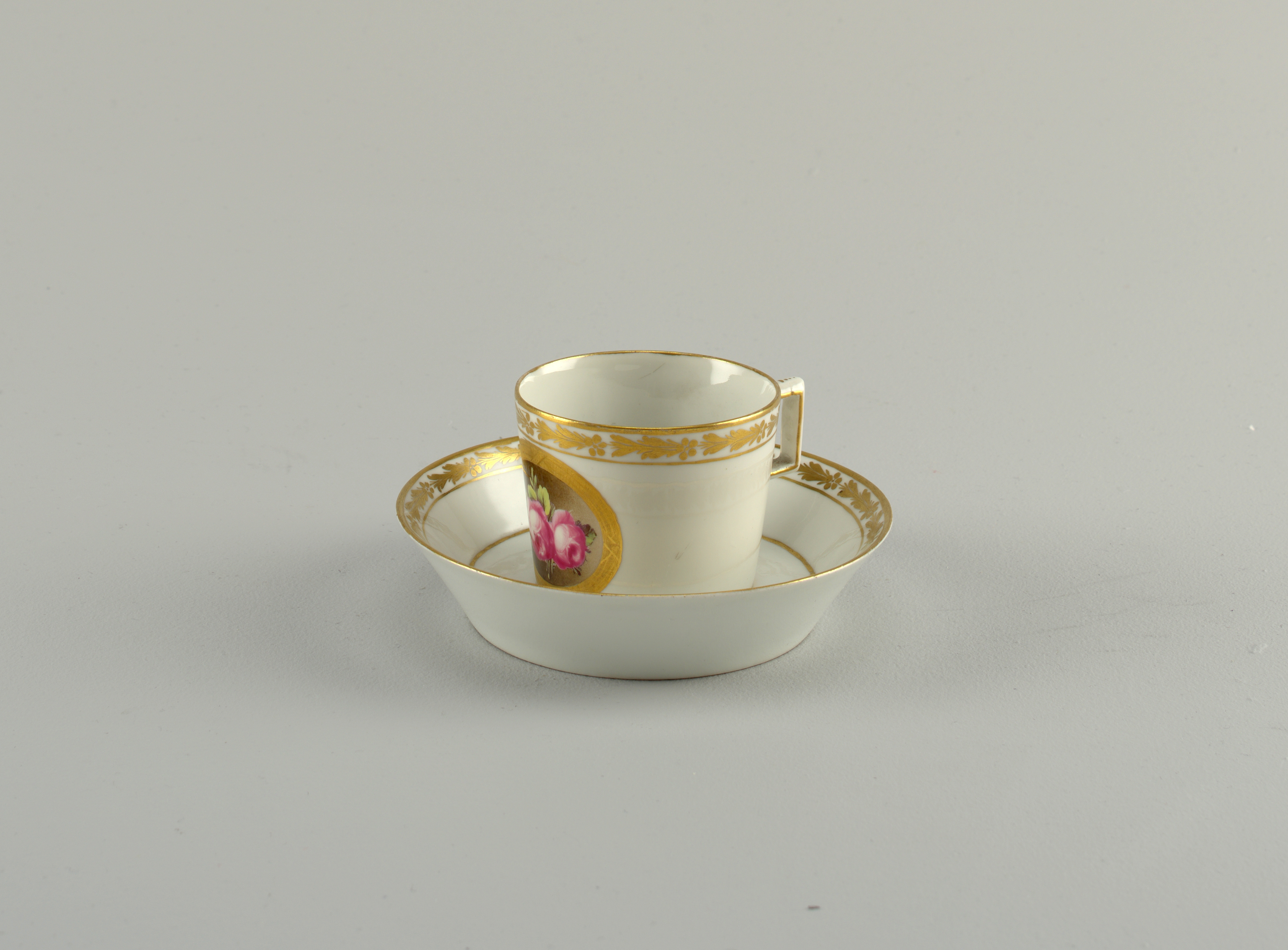 Cup and Saucer with Rose Medallion Cup And Saucer; Manufactured by Fürstenberg Porcelain Manufactory (Germany); hard paste porcelain, vitreous enamel, gold; H x W x D: 5.2 × 6.8 × 8.9 cm (2 1/16 × 2 11/16 × 3 1/2 in.) H x diam.: 0.3 × 13 cm (1/8 × 5 1/8 in.); Bequest of Erskine Hewitt; 1938-57-708-a,b