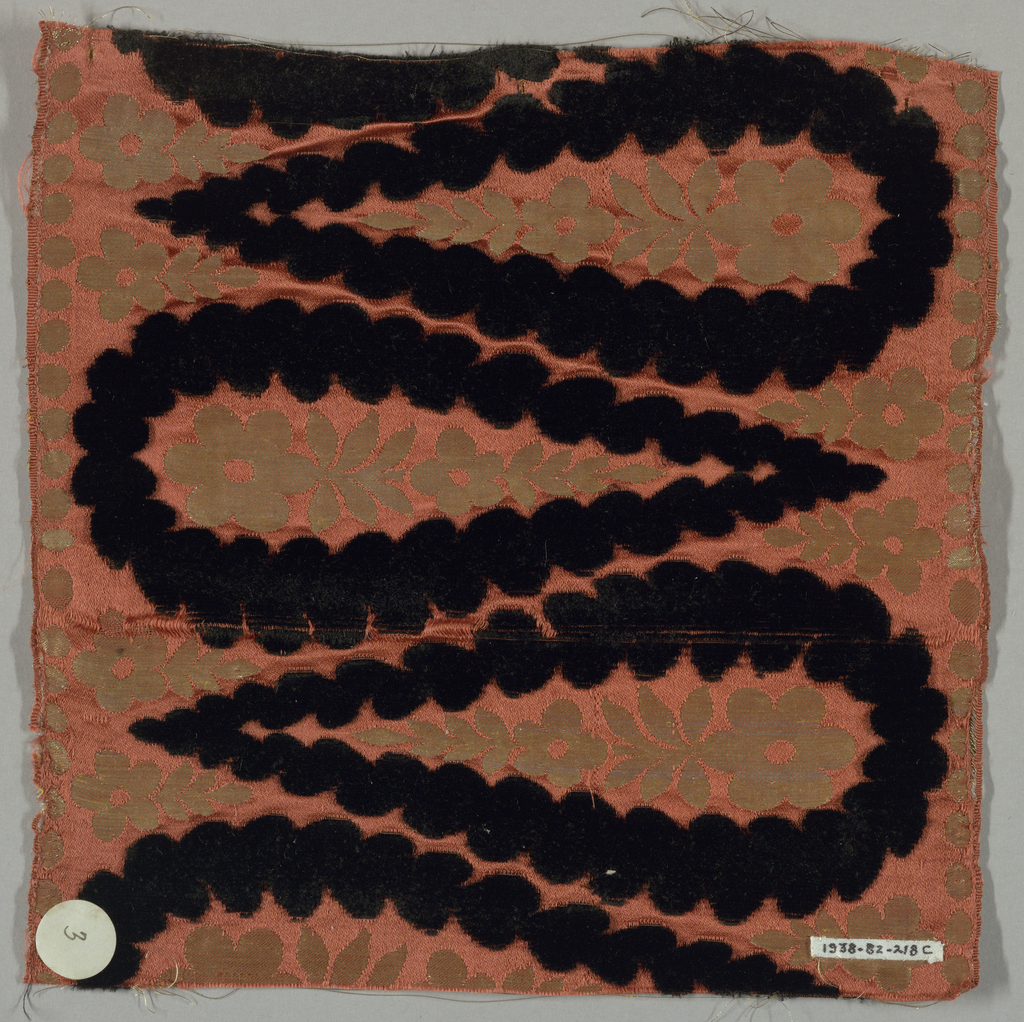 This is a Ribbon sample. It is dated ca. 1919 and we acquired it in 1938. Its medium is silk, metallic thread and its technique is cut and voided supplementary warp pile (velvet) in a satin foundation. It is a part of the Textiles department.