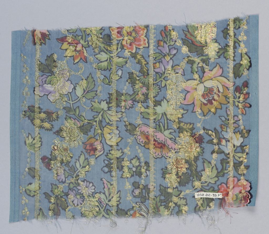 This is a Textile. It is dated ca. 1919 and we acquired it in 1938. Its medium is silk, metallic thread and its technique is printed on plain weave with supplementary weft. It is a part of the Textiles department.