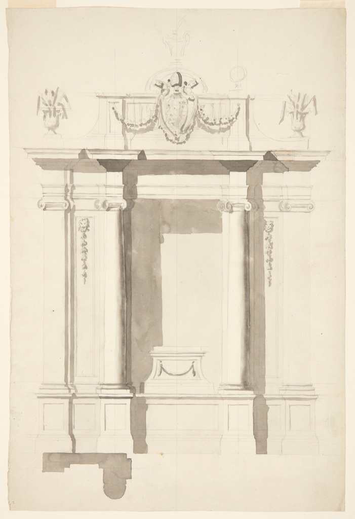 This is a Drawing. It was architect: Giuseppe Valadier. It is dated 1775 and we acquired it in 1938. Its medium is graphite, gray wash support: laid paper. It is a part of the Drawings, Prints, and Graphic Design department.