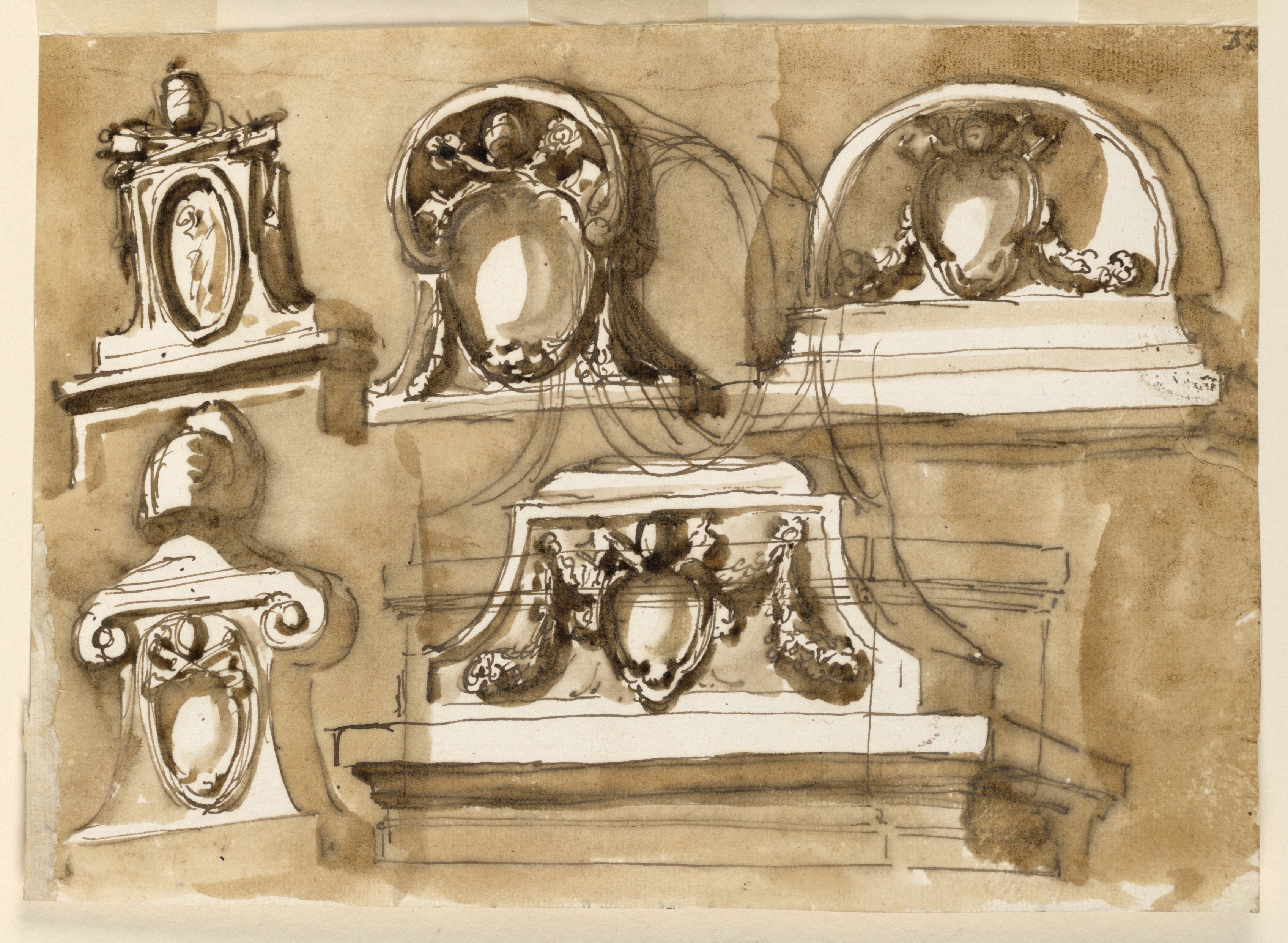 Drawing, Five designs for an overdoor; Designed by Giuseppe Barberi (Italian, 1746–1809); Italy; pen and brown ink, brush and brown wash on off-white laid paper, lined; Image: 19.1 x 27.3 cm (7 1/2 x 10 3/4 in.); Museum purchase through gift of various donors and from Eleanor G. Hewitt Fund; 1938-88-1818