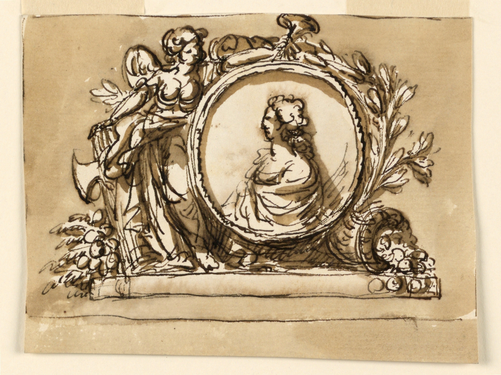 Drawing, Allegorical portrait; Designed by Giuseppe Barberi (Italian, 1746–1809); Italy; pen and brown ink, brush and brown wash on off-white laid paper; Image: 9.5 x 12.8 cm (3 3/4 x 5 1/16 in.); Museum purchase through gift of various donors and from Eleanor G. Hewitt Fund; 1938-88-1832