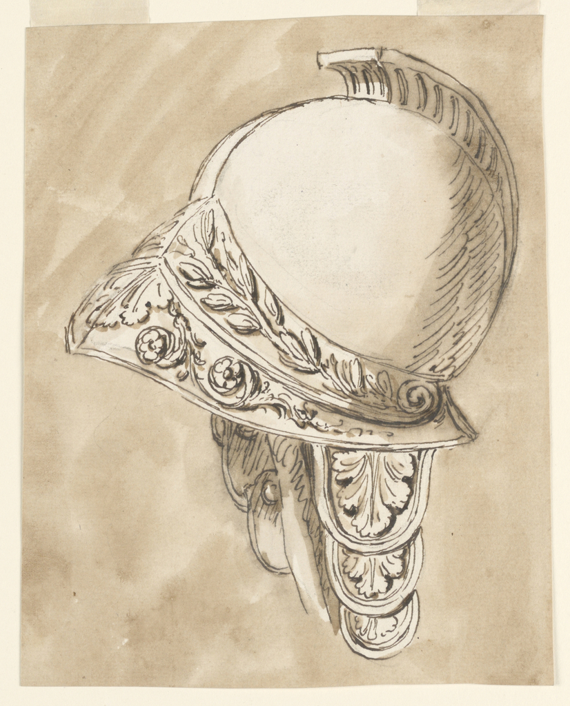 Drawing, Helmet; Designed by Giuseppe Barberi (Italian, 1746–1809); Italy; pen and brown ink, brush and brown wash on off-white laid paper; Image: 18.8 x 14.8 cm (7 3/8 x 5 13/16 in.); Museum purchase through gift of various donors and from Eleanor G. Hewitt Fund; 1938-88-1990