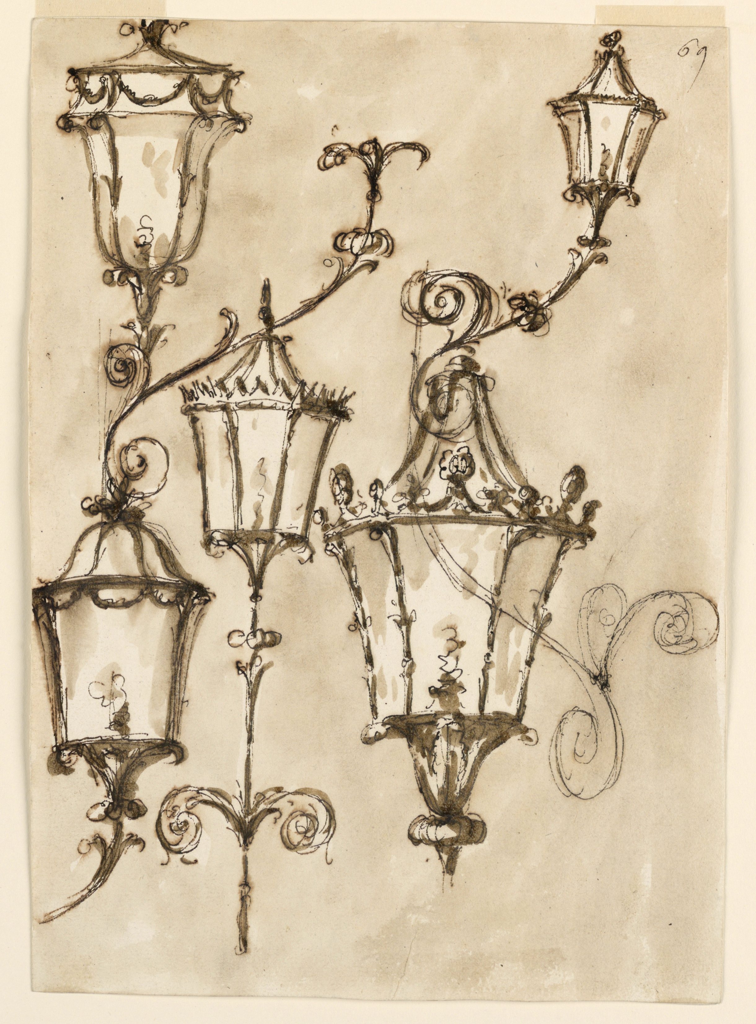 Drawing, Lanterns; Designed by Giuseppe Barberi (Italian, 1746–1809); Italy; pen and brown ink, brush and brown wash on off-white laid paper, lined; Image: 26.5 x 18.7 cm (10 7/16 x 7 3/8 in.); Museum purchase through gift of various donors and from Eleanor G. Hewitt Fund; 1938-88-2011
