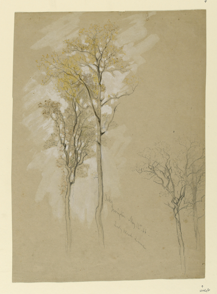 Drawing, Oaks, Lady Wood Lane, Irvington; Samuel Colman (American, 1832 - 1920); USA; recto: graphite, brush and watercolors on brown paper verso: graphite; 32.5 x 7.7 cm (12 13/16 x 3 in.); Gift of Mrs. Samuel Colman; 1939-85-3