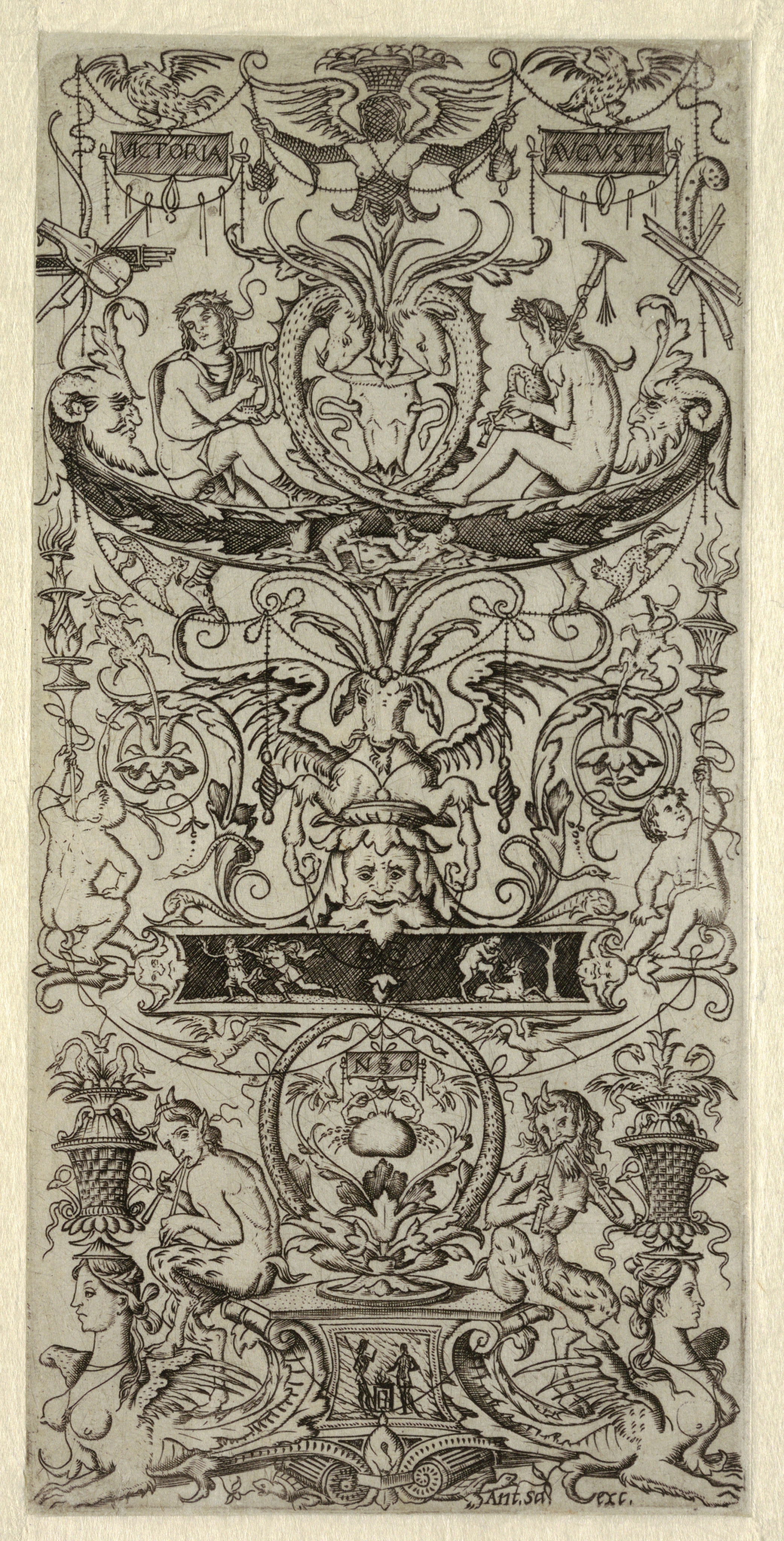 Print, Ornament Panel Inscribed "Victoria Augusta"; Published by Antonio Salamanca (Italian, ca. 1500 - 1562); Print Maker: Nicoletto da Modena (Italian, active 1500 – 1522); Italy; engraving on off white laid paper; H x W: 26.5 × 13 cm (10 7/16 × 5 1/8 in.) Mat: 45.7 × 35.6 cm (18 × 14 in.); Museum purchase through gift of Eleanor and Sarah Hewitt; 1946-29-4