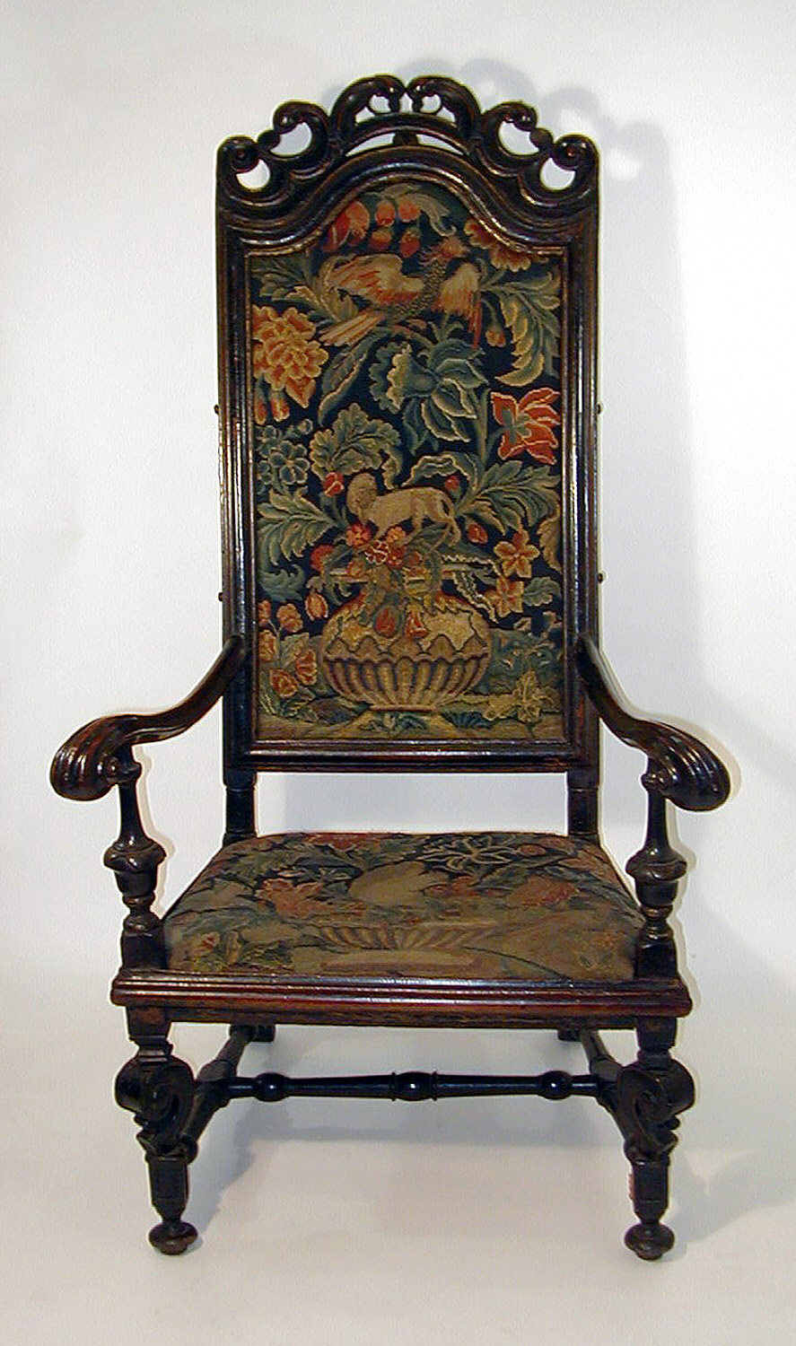 wooden chair with needlepoint upholstery Armchair; England; walnut, wool needlepoint; H x W x D: 135 x 73 x 67.5cm (53 1/8 x 28 3/4 x 26 9/16in.) H x W x D: 135.3 x 185.4 x 175.3 cm (53 1/4 in. x 6 ft. 1 in. x 5 ft. 9 in.); 1949-16-1-a,b