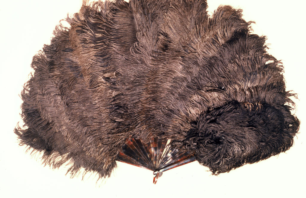 This is a Brisé fan. It is dated late 19th–early 20th century and we acquired it in 1949. Its medium is tortoise shell sticks, ostrich feathers. It is a part of the Textiles department.