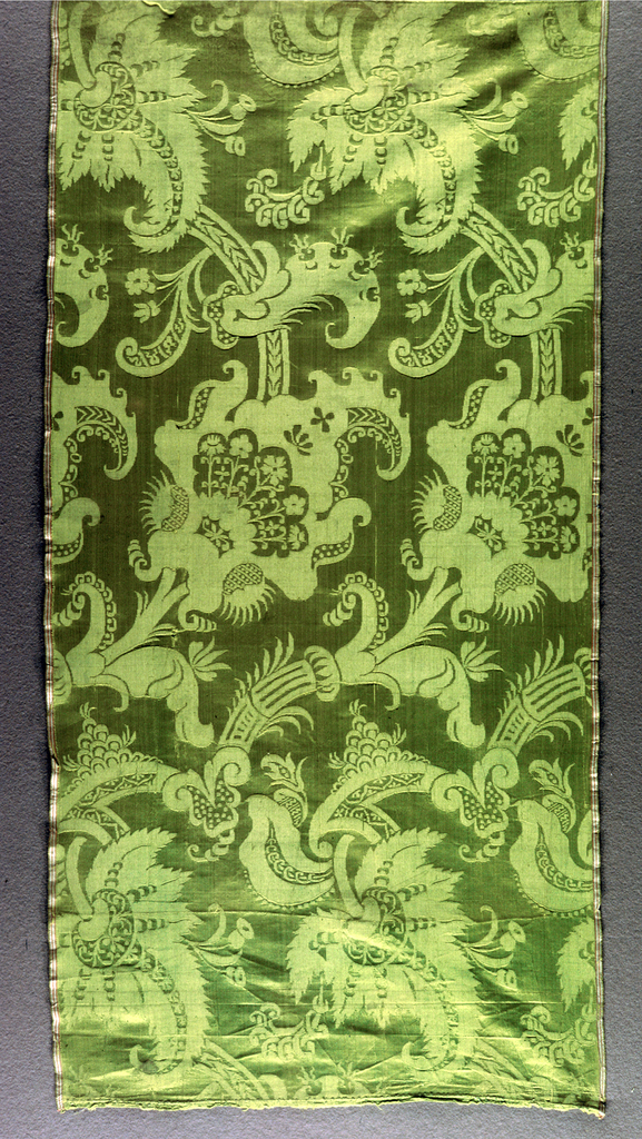 This is a Fragment. It is dated 18th century and we acquired it in 1949. Its technique is 5-harness satin damask. It is a part of the Textiles department.