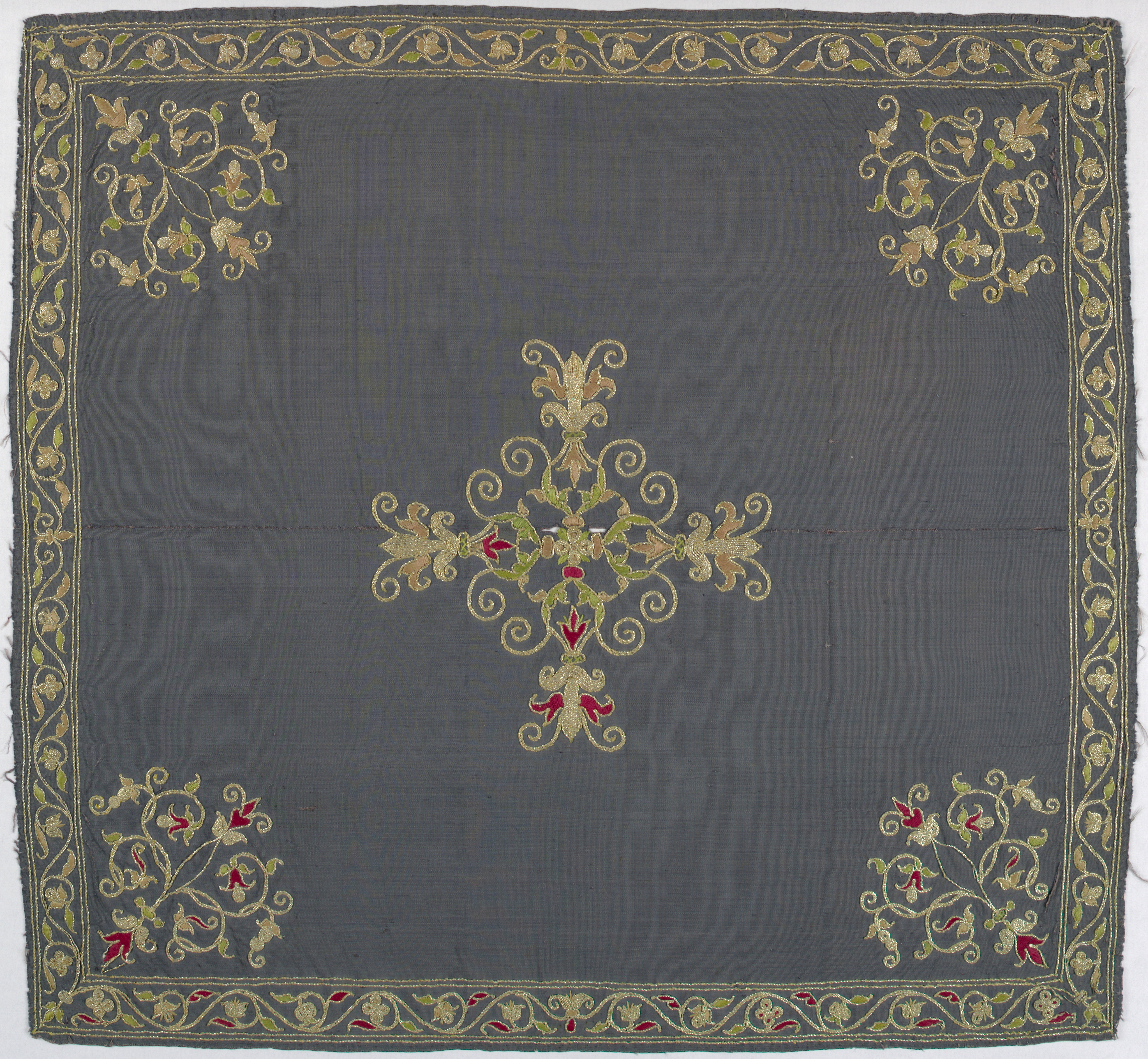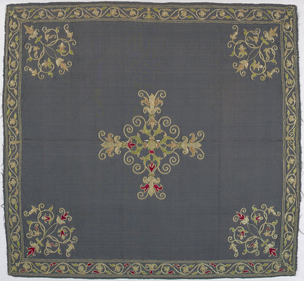 This is a Chalice cover. It is dated 16th–17th century and we acquired it in 1949. Its medium is silk, metallic thread and its technique is satin stitch embroidery. It is a part of the Textiles department.