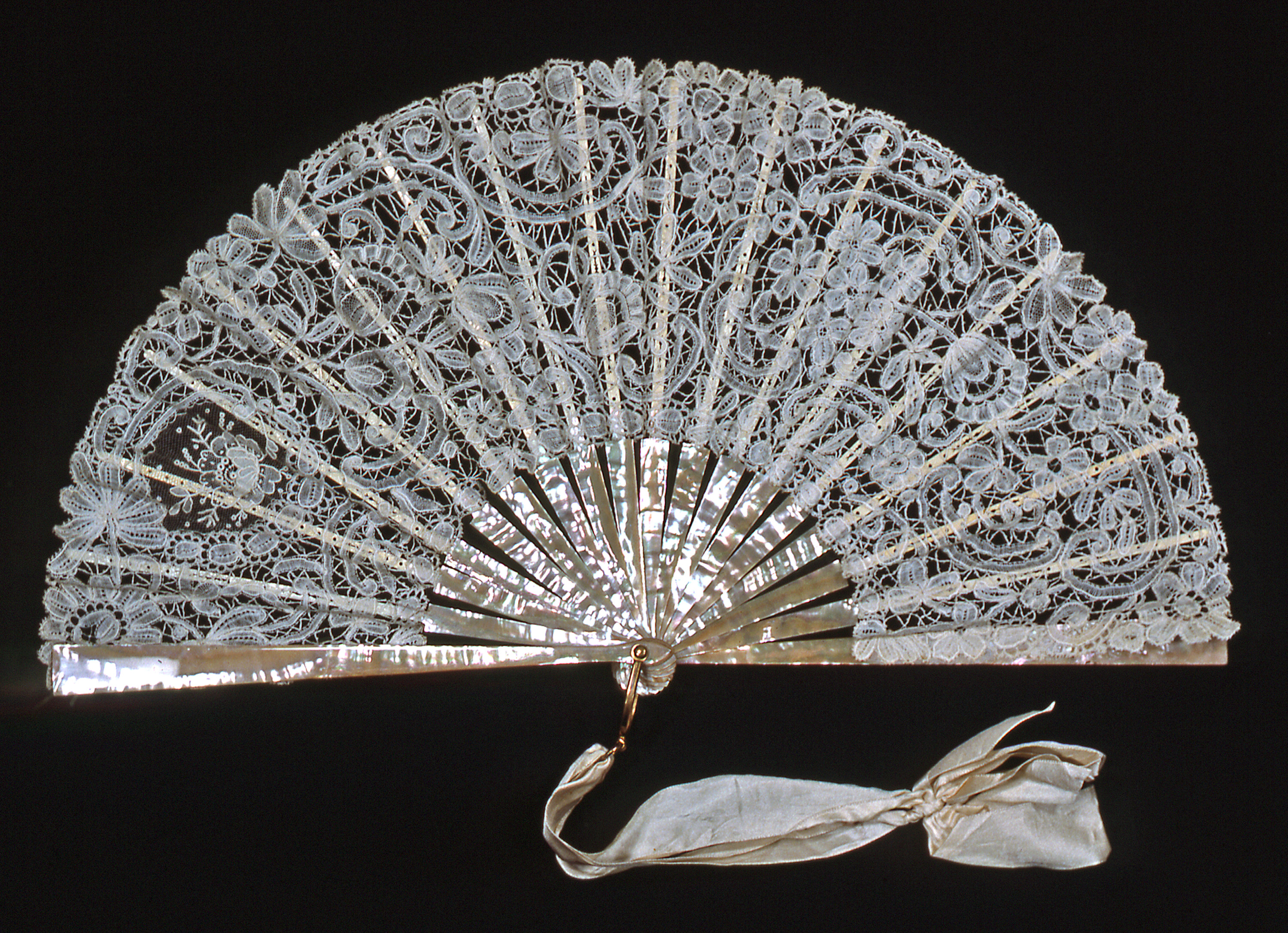 This is a Pleated fan. It is dated 19th century and we acquired it in 1949. Its medium is linen bobbin lace leaf, mother-of-pearl sticks, silk ribbon. It is a part of the Textiles department.