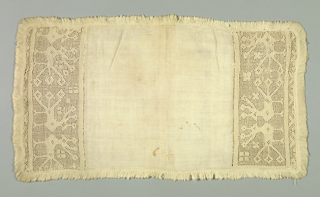 This is a Table mat. It is dated 17th century and we acquired it in 1950. Its medium is linen and its technique is withdrawn element work. It is a part of the Textiles department.