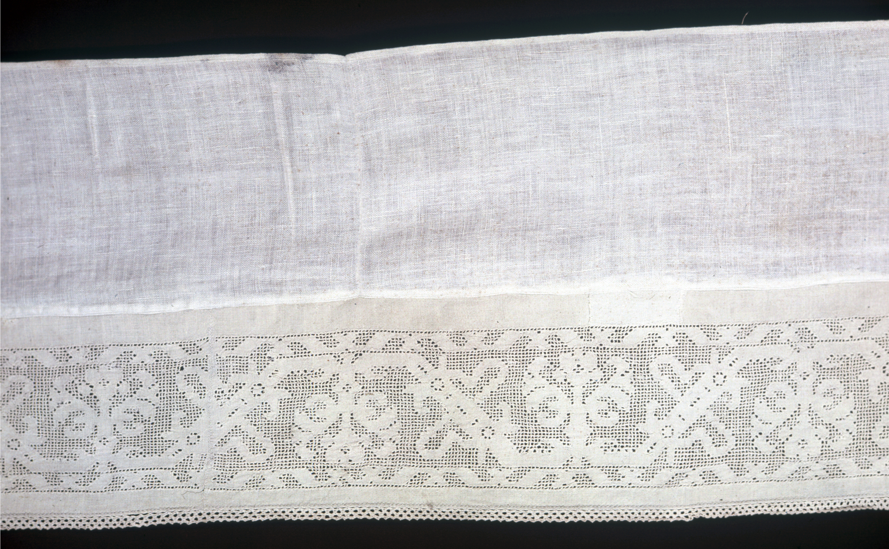 This is a panel. It is dated 17th century and we acquired it in 1950. Its medium is linen and its technique is withdrawn element work; bobbin lace. It is a part of the Textiles department.
