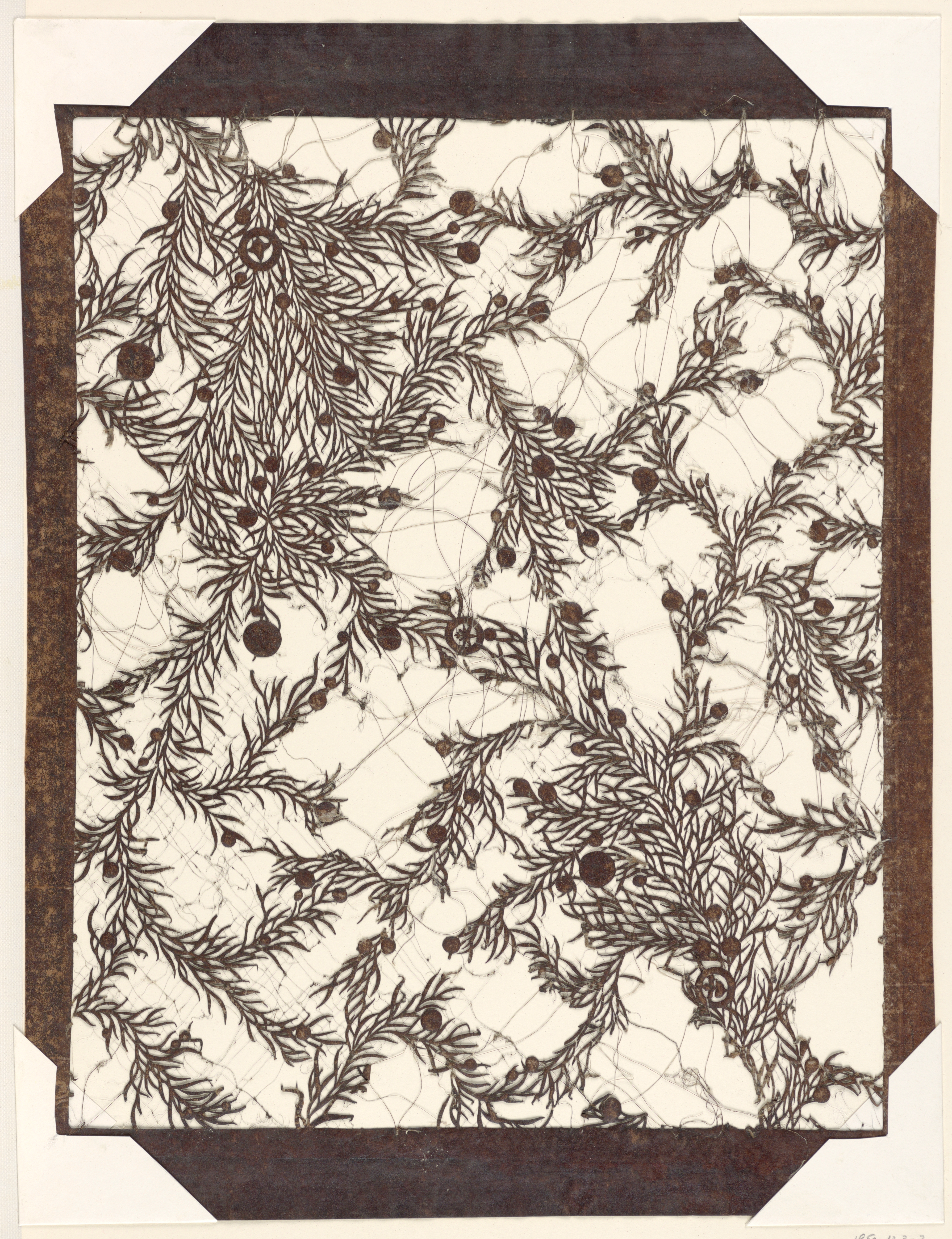 Katagami, Juniper Leaves and Berries; mulberry paper (kozo washi) treated with fermented persimmon tannin (kakishibu), and silk threads (itoire); Sheet: 43.2 x 33 cm (17 x 13 in.); Gift of Mary Rutherford Jay; 1950-123-2